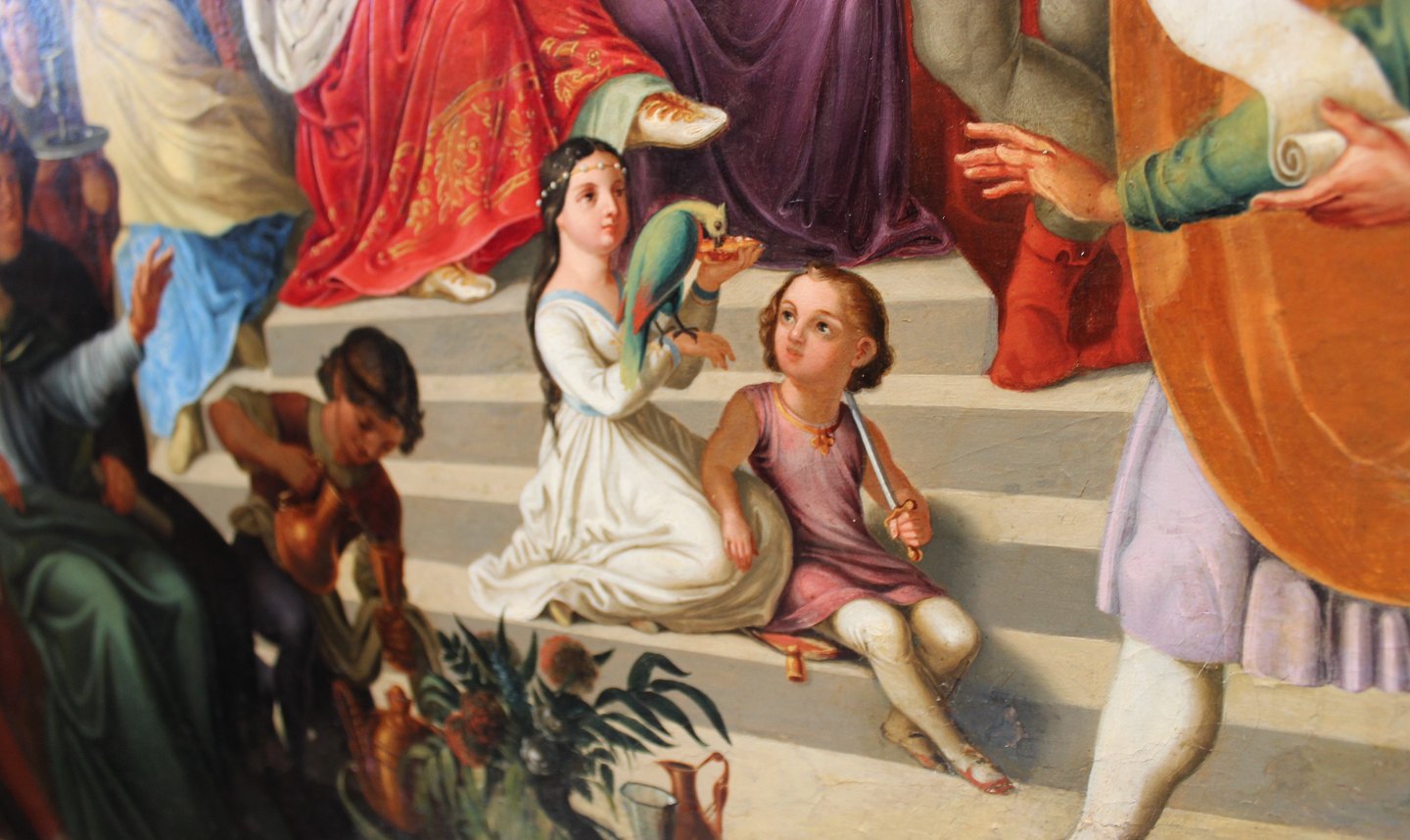 Oil painting on canvas from the 19th century by the German painter G. Otti. The painting is called "Der Niebelunge Liet", a scene which probably represents the wedding of Attila and the German princess Ildikó.
