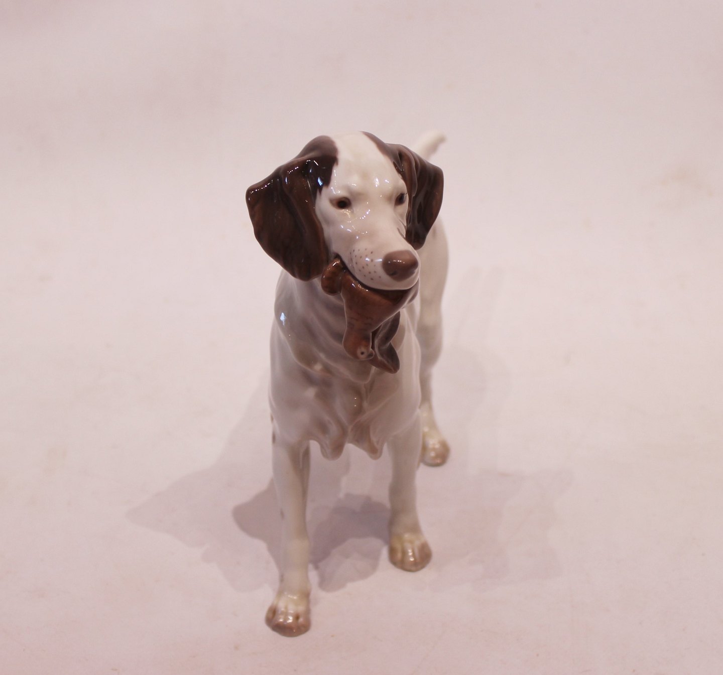 Porcelænsfigur i form af jagthund med bytte af Bing og Grøndahl. designet af Lauritz Jensen. Figuren er i flot stand.