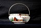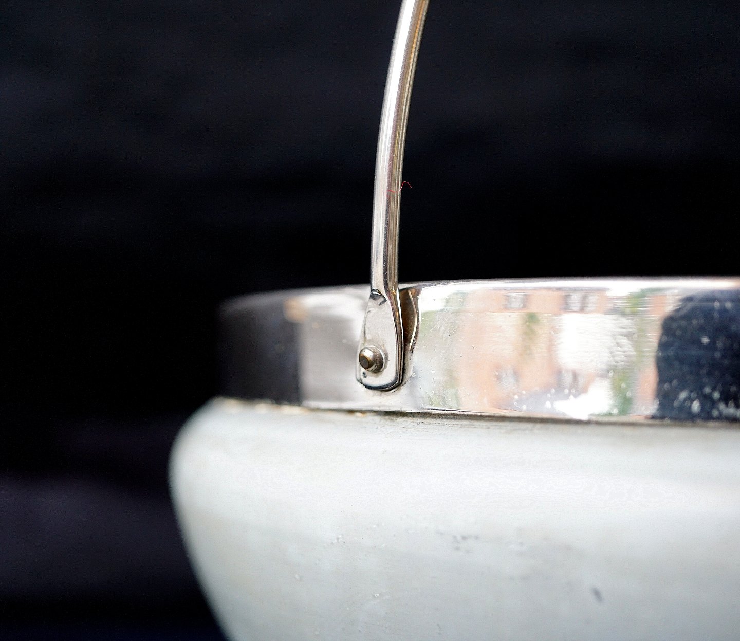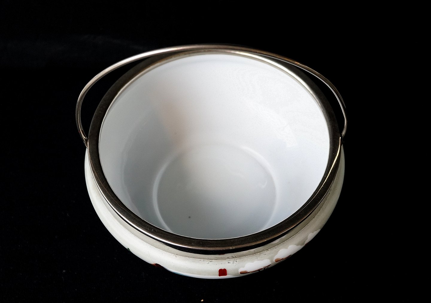 Opaline skål med hank af sølv og kantet med sølv. Mønsteret der er på skålen forestiller et hus og vinterlandskab