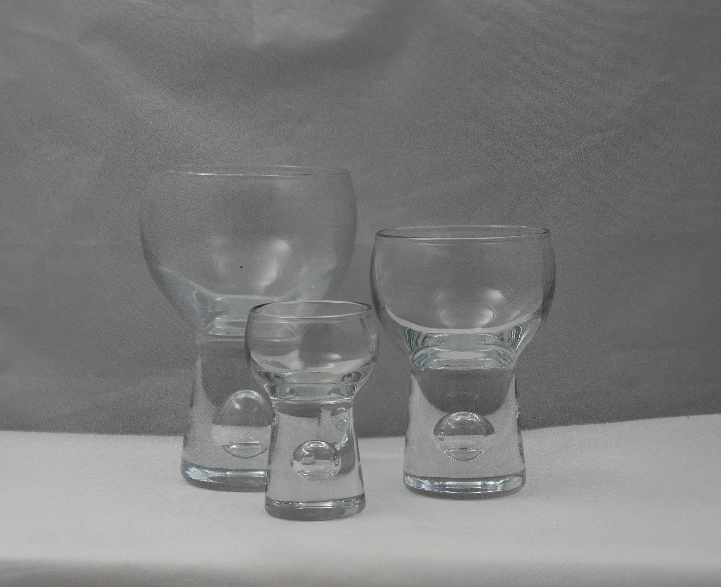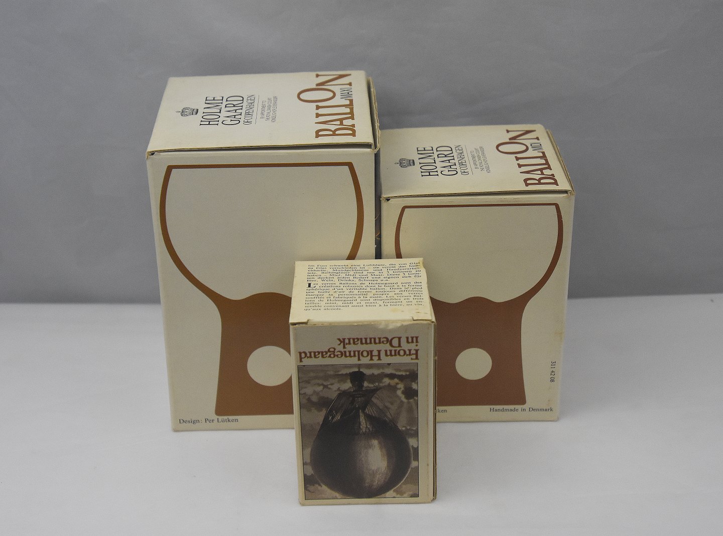 Text available in Danish: Ballonglas, individuelle, mundblæste og håndforarbejdet med stor luftblære i stand, maxi, midi, mini servicen findes i disse 3 størrelser. Ballonglassene er lavet i 1972