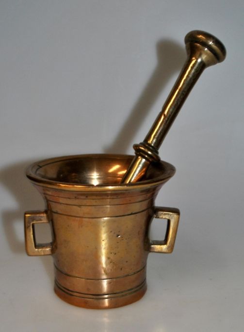 Smaller brass mortar with pistil. 19th century Denmark.