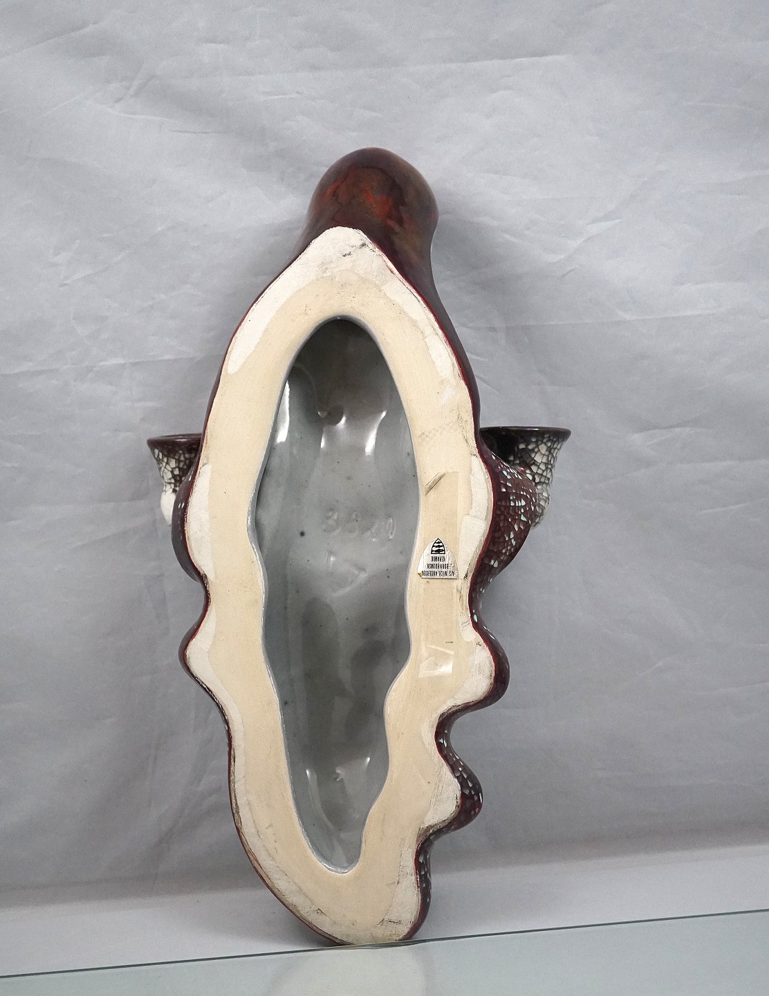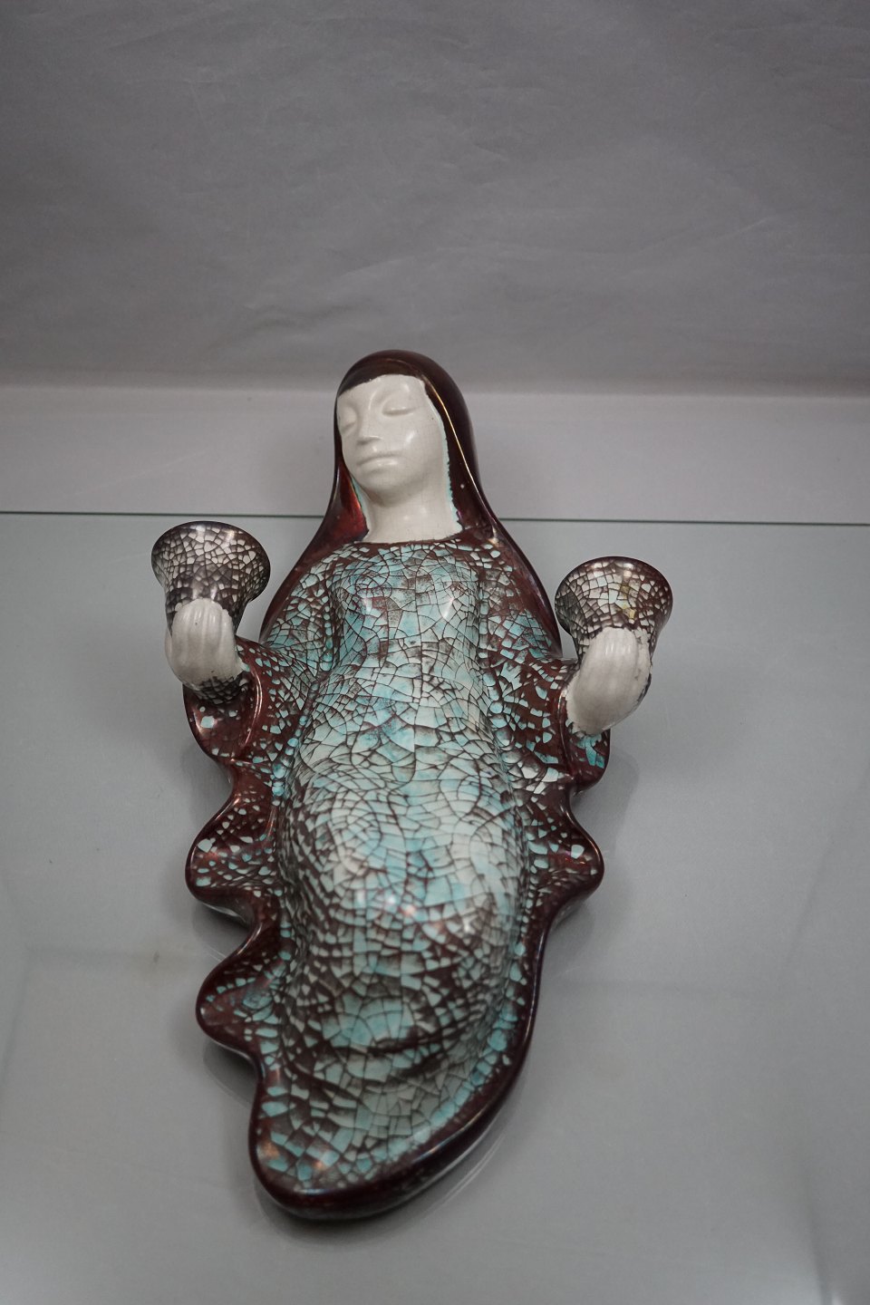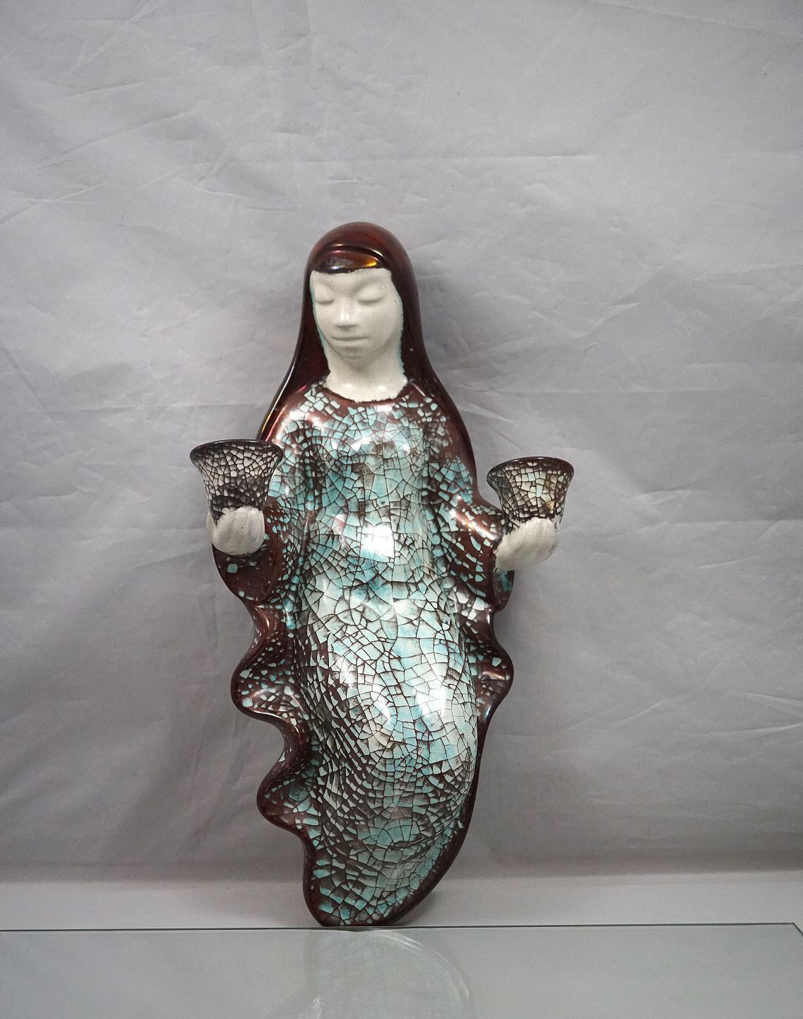 Madonna vægstage, nr 3829, fra Michael Andersens, Bornholm. Vægstagen er til 2 lys og udført med krakelè glassur