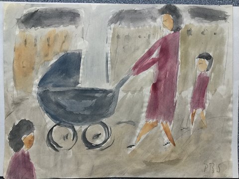Akvarel af Peder Brøndum Sørensen - Mor med barnevogn.