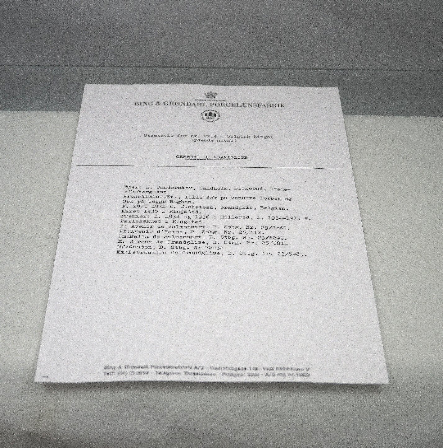 Bing & Grøndahl, hingst nr 2234. Flot belgisk bryggerhingst, med kopi af original stamtavle. Hingsten er 1. sortering