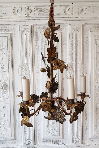 Meget smuk 1800tals fransk femarmet lysekrone dekoreret med blomster og blade.