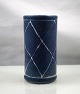 Allis. Blå keramik vase, der er dekoreret med hvide striber, der danner romber.