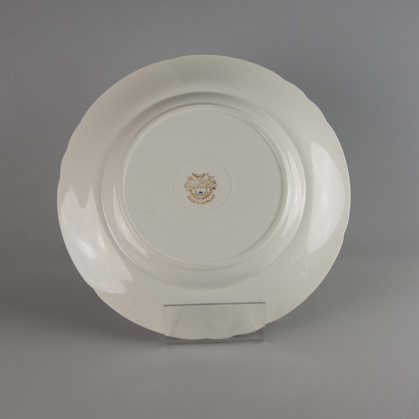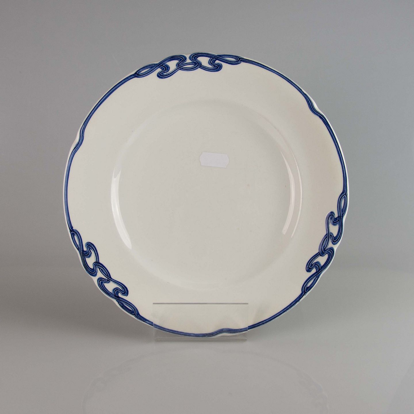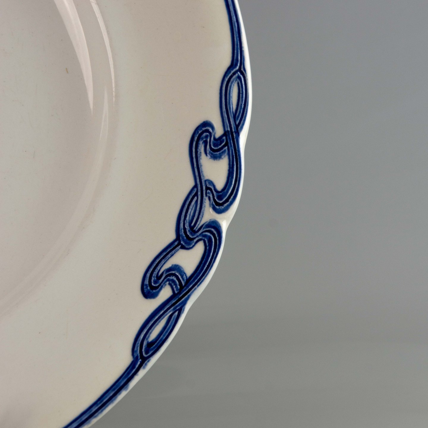 Tallerken i hvid fajance med dekoration af blå abstrakt mønster langs kanten.
