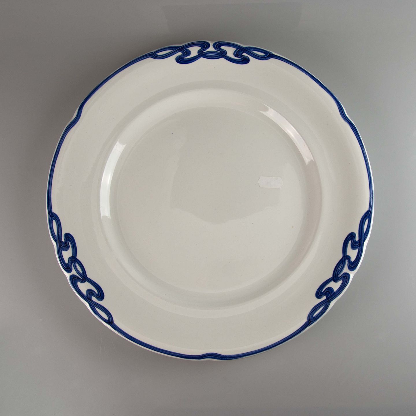 Fad i hvid fajance med dekoration af blå abstrakt mønster langs kanten.