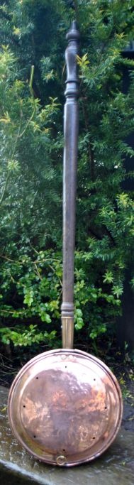 Baroque copper heat basin, 18th century Denmark. Lid decorated with floral motif. With oak wood handle. Length: 112 cm. Dia. 29 cm.