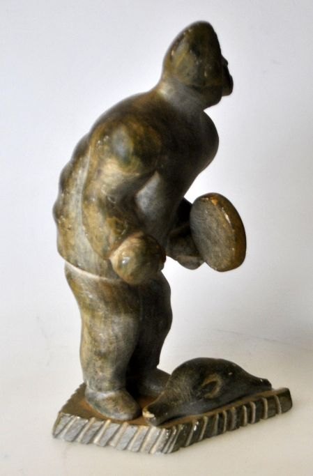 Greenlandic soapstone figure, 20th century. A man with a seal and drum.