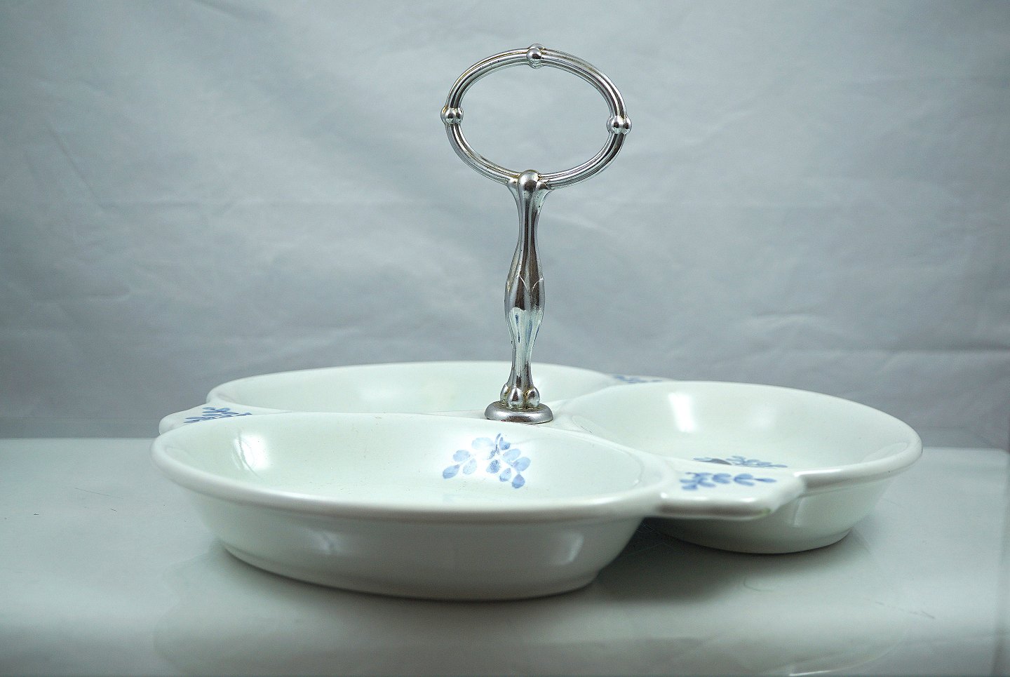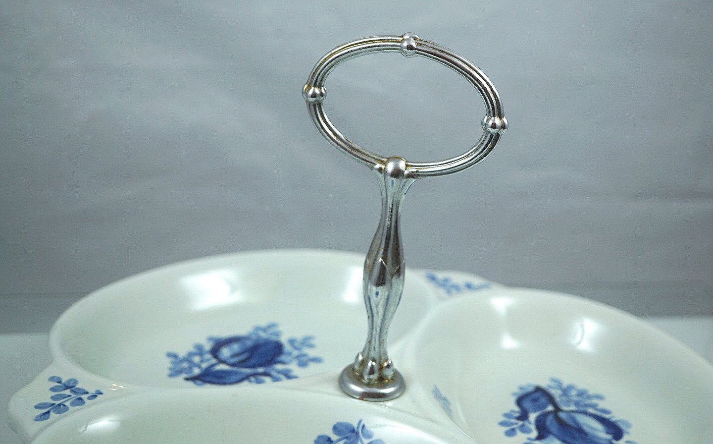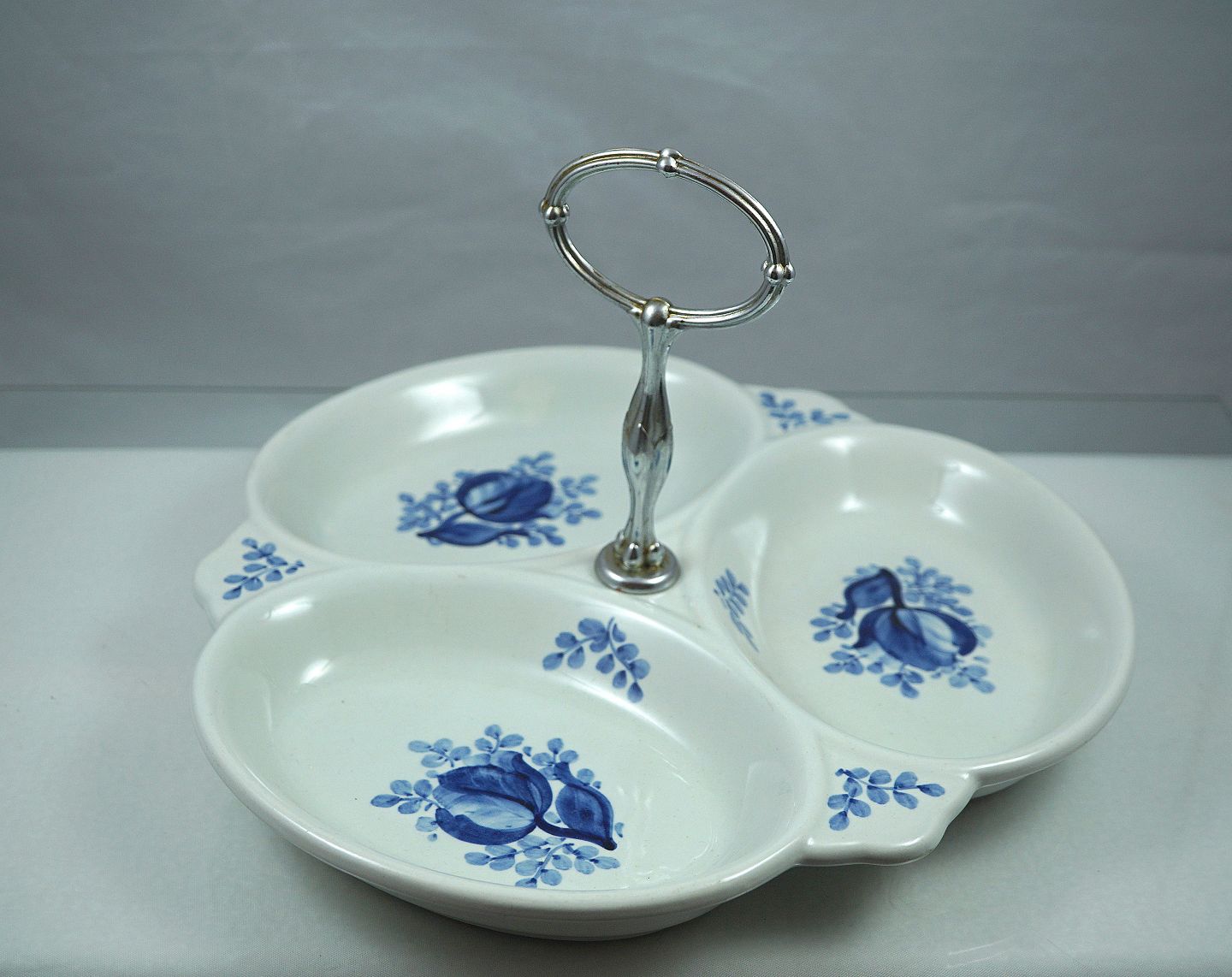 Text available in Danish: KGL. Aluminia. Tranquebar nr. 11/1432, Cabaretfad, fadet har sølvfarvet håndtag.