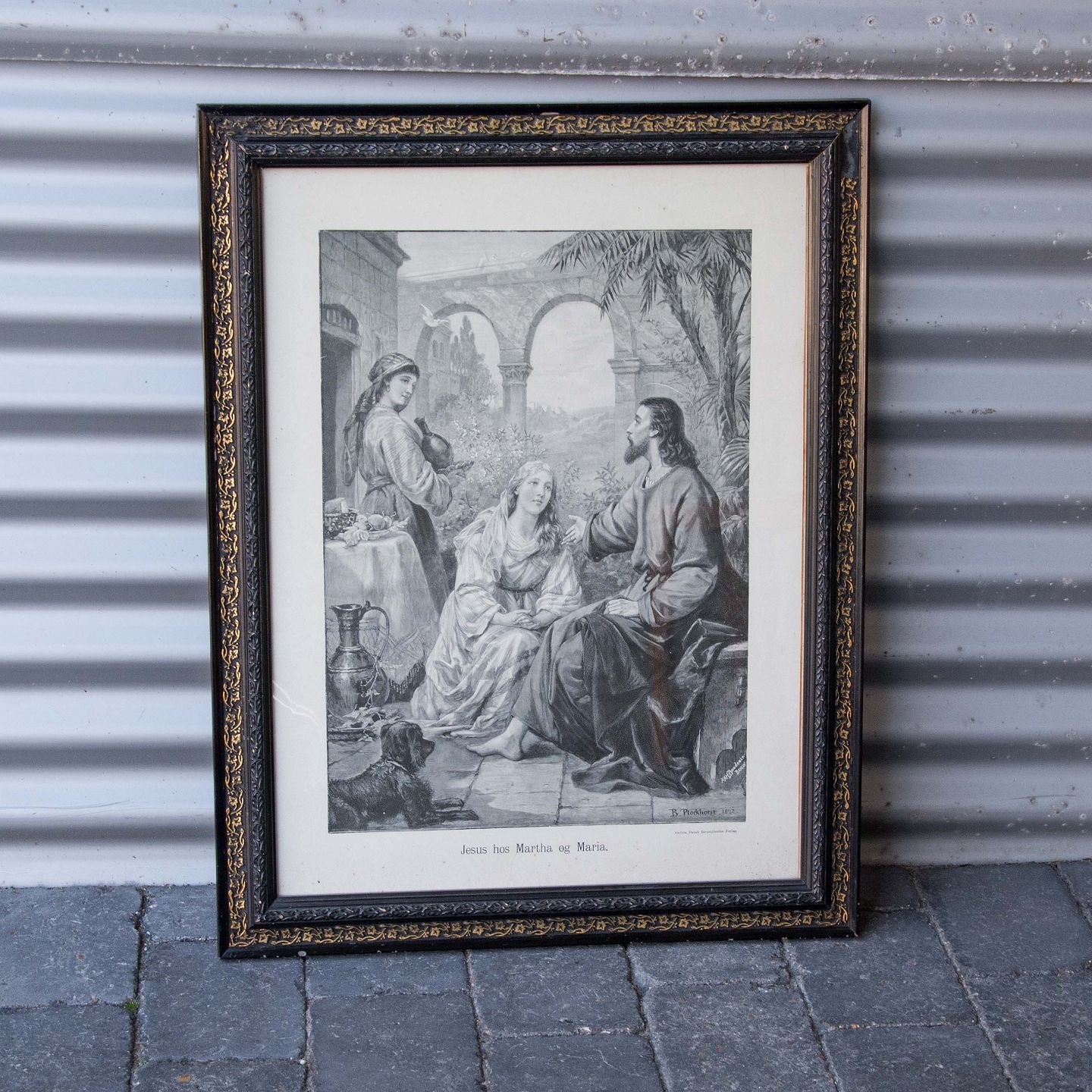 Religiøst bogtryk med motiv af Jesus, Martha og Maria