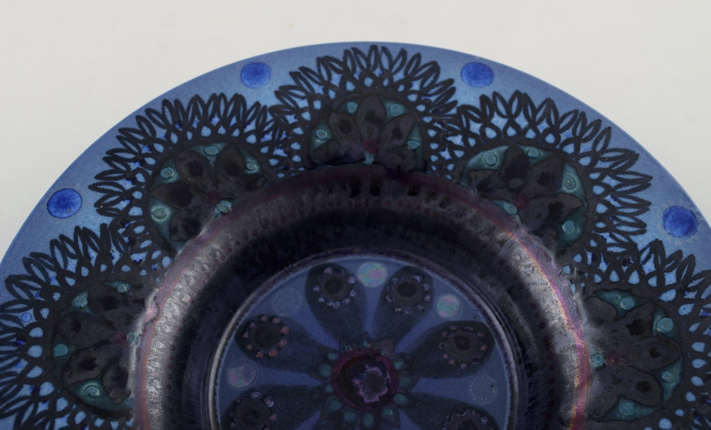 Friedl Holzer Kjellberg for Arabia. Bowl in glazed ceramics. Flowers and beautiful glaze in blue shades. Finnish design, 1950's.