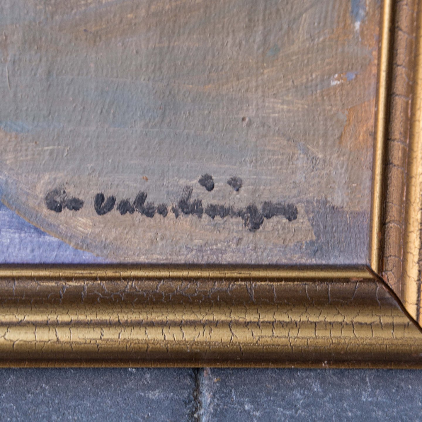 Maleri af landskab med udsigt udover hav, olie på lærred