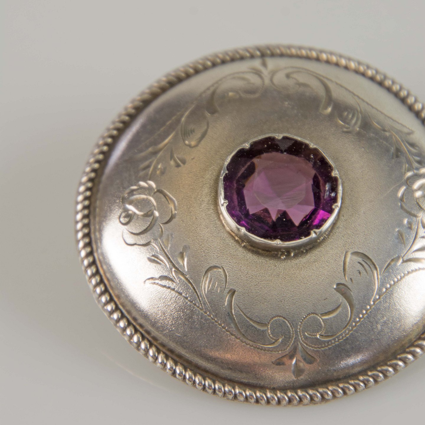 Rund broche i sølv med ametyst, mønster og snoet kant