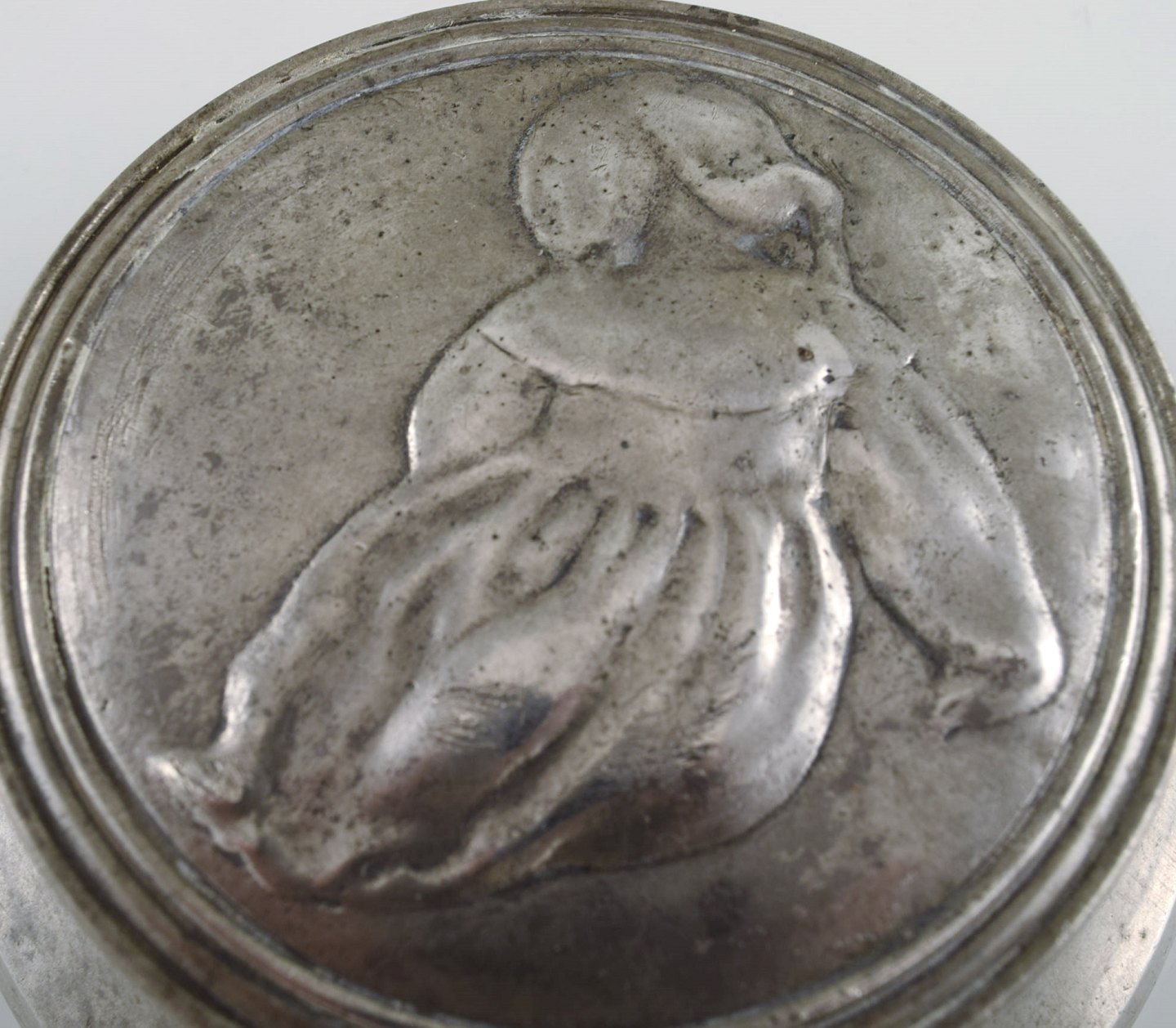 Ballin/Hertz, Danmark. Skønvirke lågæske i tin dekoreret med ung pige. Ca. 1920.