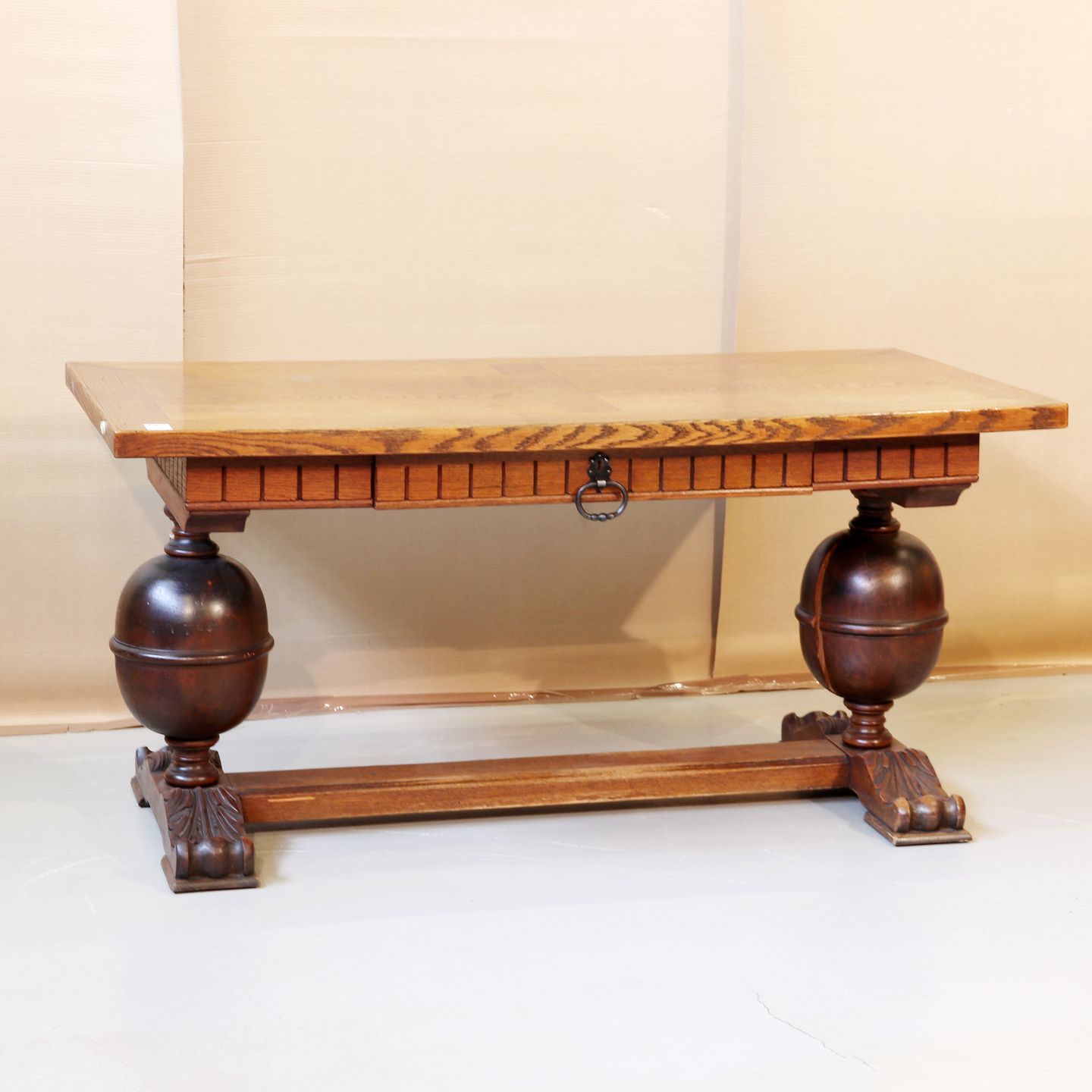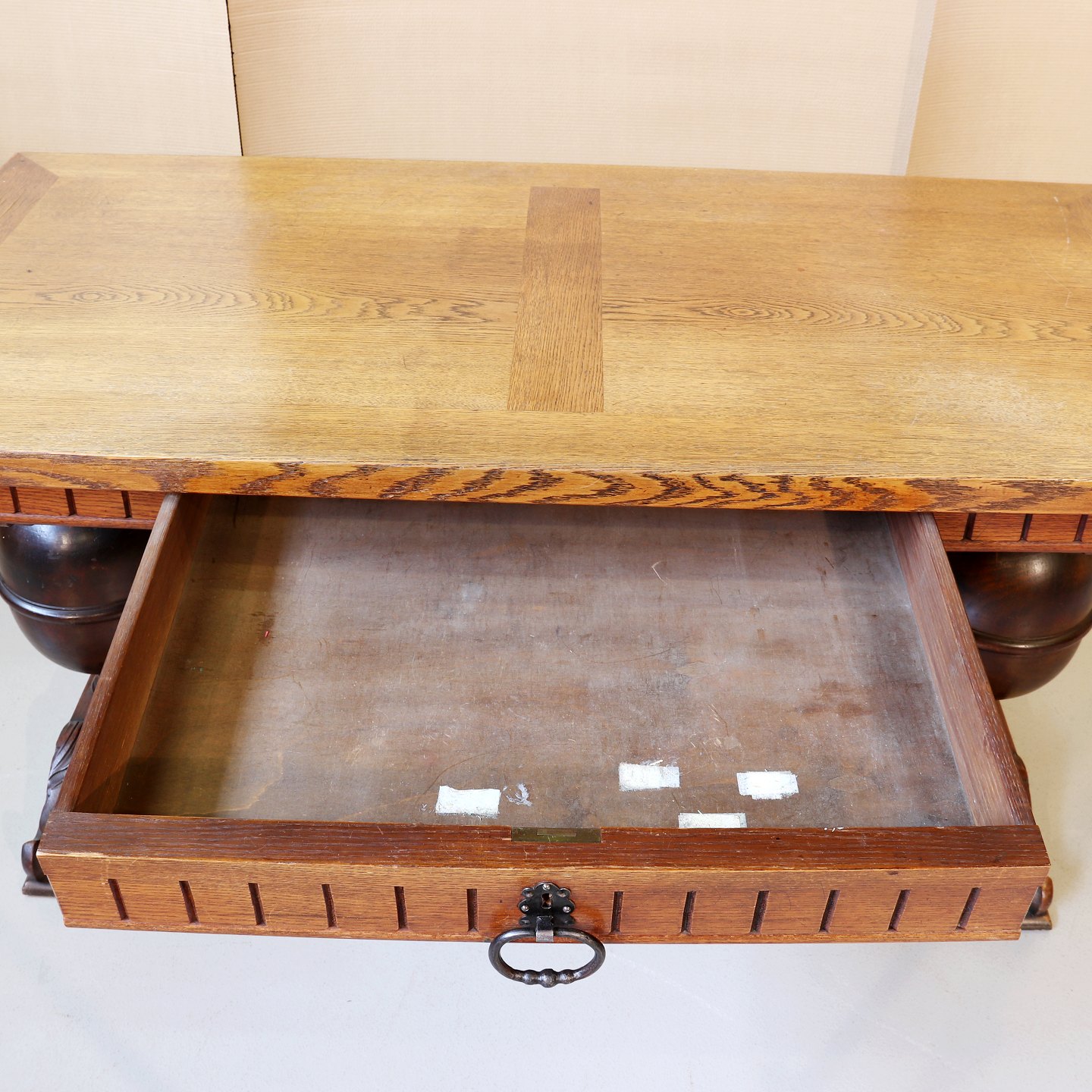 Text available in Danish: Skrivebord i bejdset, fineret og lakeret egetræ m. skuffe, i renæssancestil,