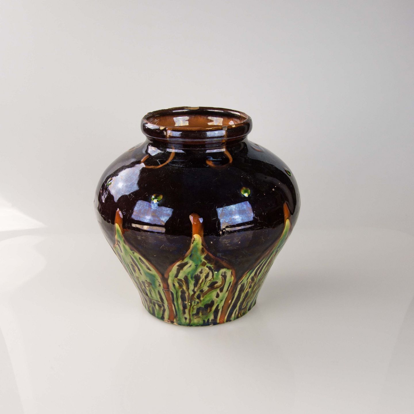 Vase i keramik med mørk blå og grøn glasur i abstrakt mønstre