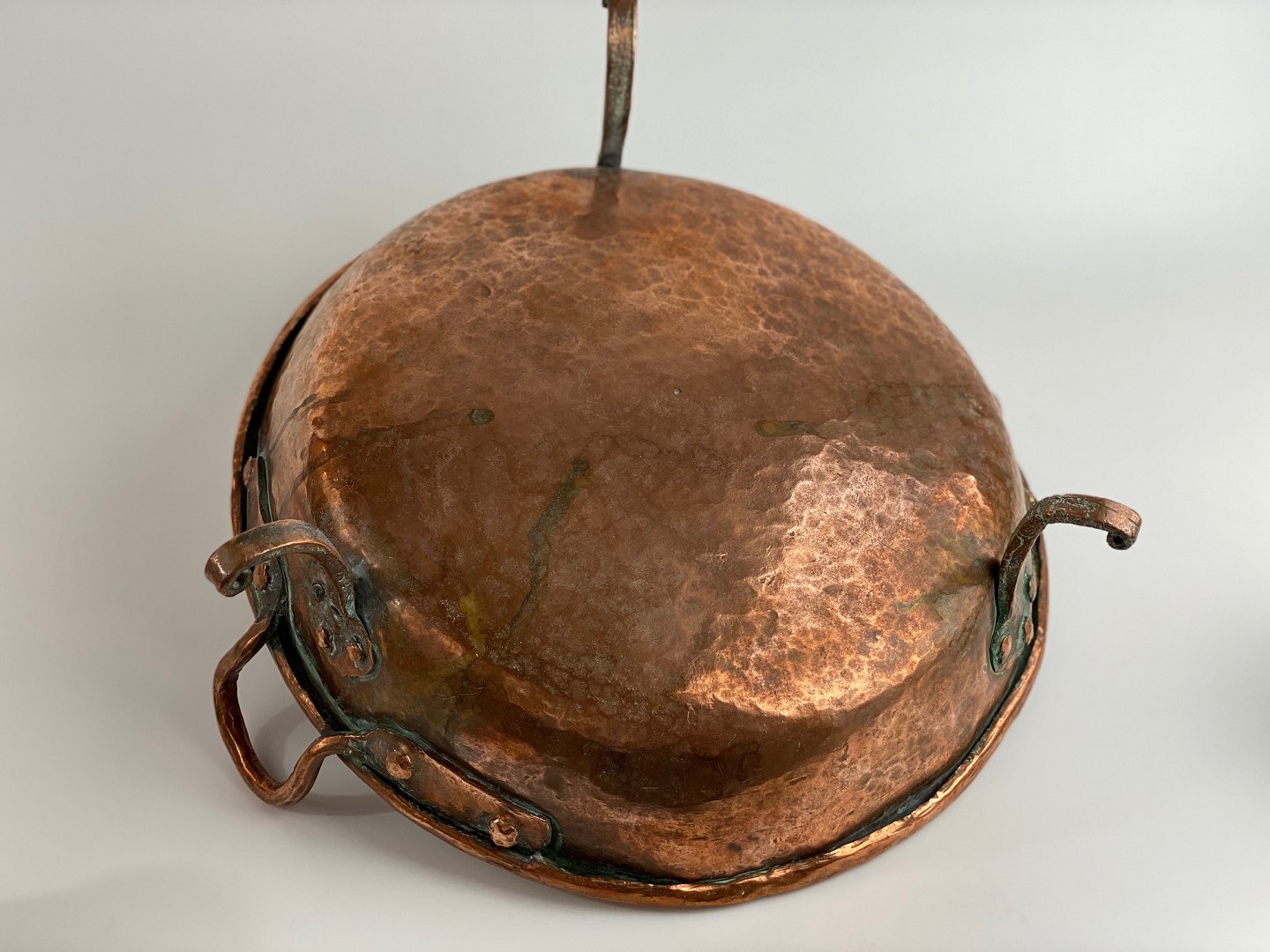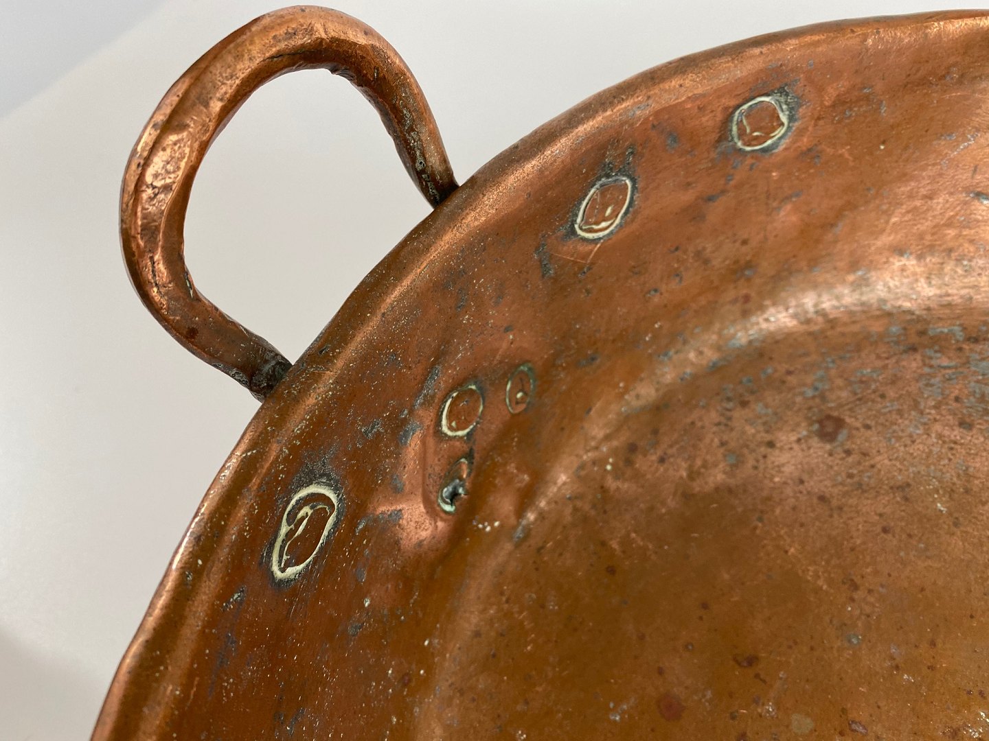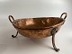 Heavy, antique copper dish on three legs. 1800s. Width with handle / ears 42.30 centimetersWidth without handles / ears 38.50 centimetersHeight with ears 19 centimetersHeight without ears 16 centimeters
