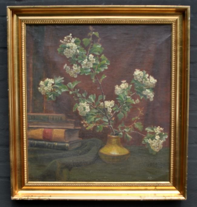 Johansen, Axel (1872 - 1938) Danmark: Opstilling med bøger og gren i vase. Olie på lærred. Monogrammeret. 67 x 60 cm.