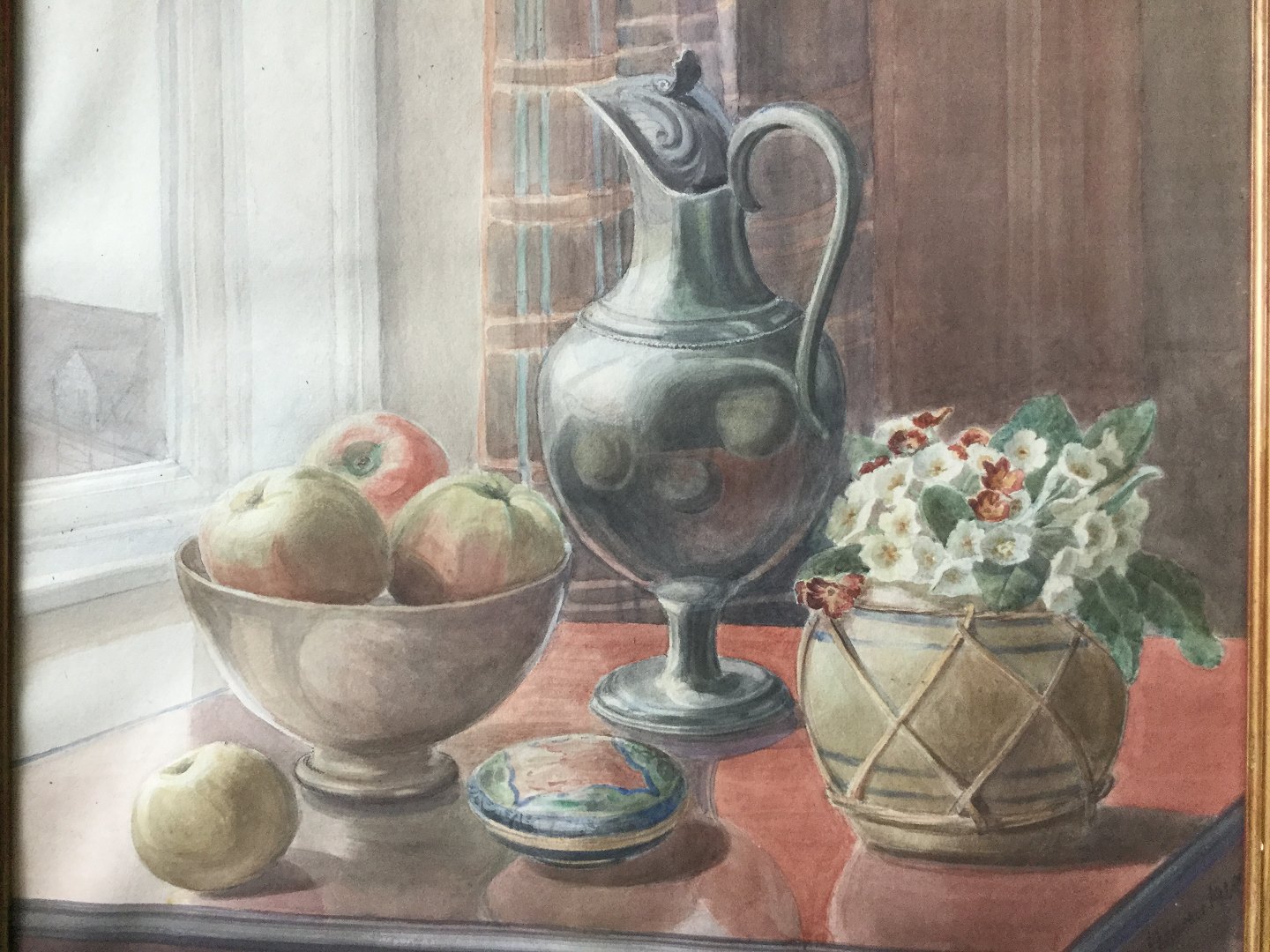Opstilling ved vindue med Jingerjar med aurikler og skål med æbler mv. 1928.