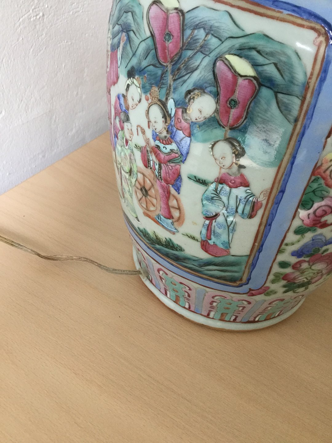 Text available in Danish: Gammel kinesisk vase omlavet til bordlampe.