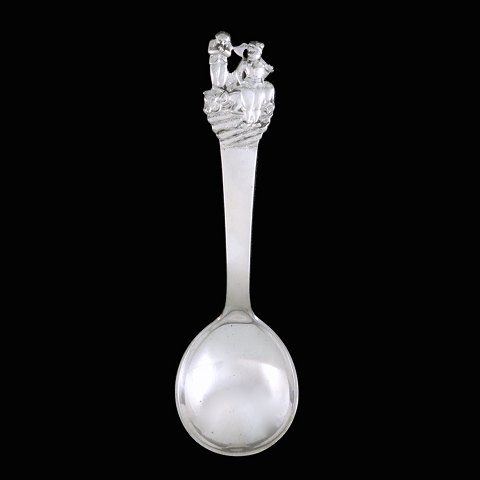 H.C. Andersen Eventyrbestik. 'Lille Claus & Store Claus'. Rund barne/dessertske i sølv med motiv fra H.C. Andersens eventyr. L. 14,5 cm.