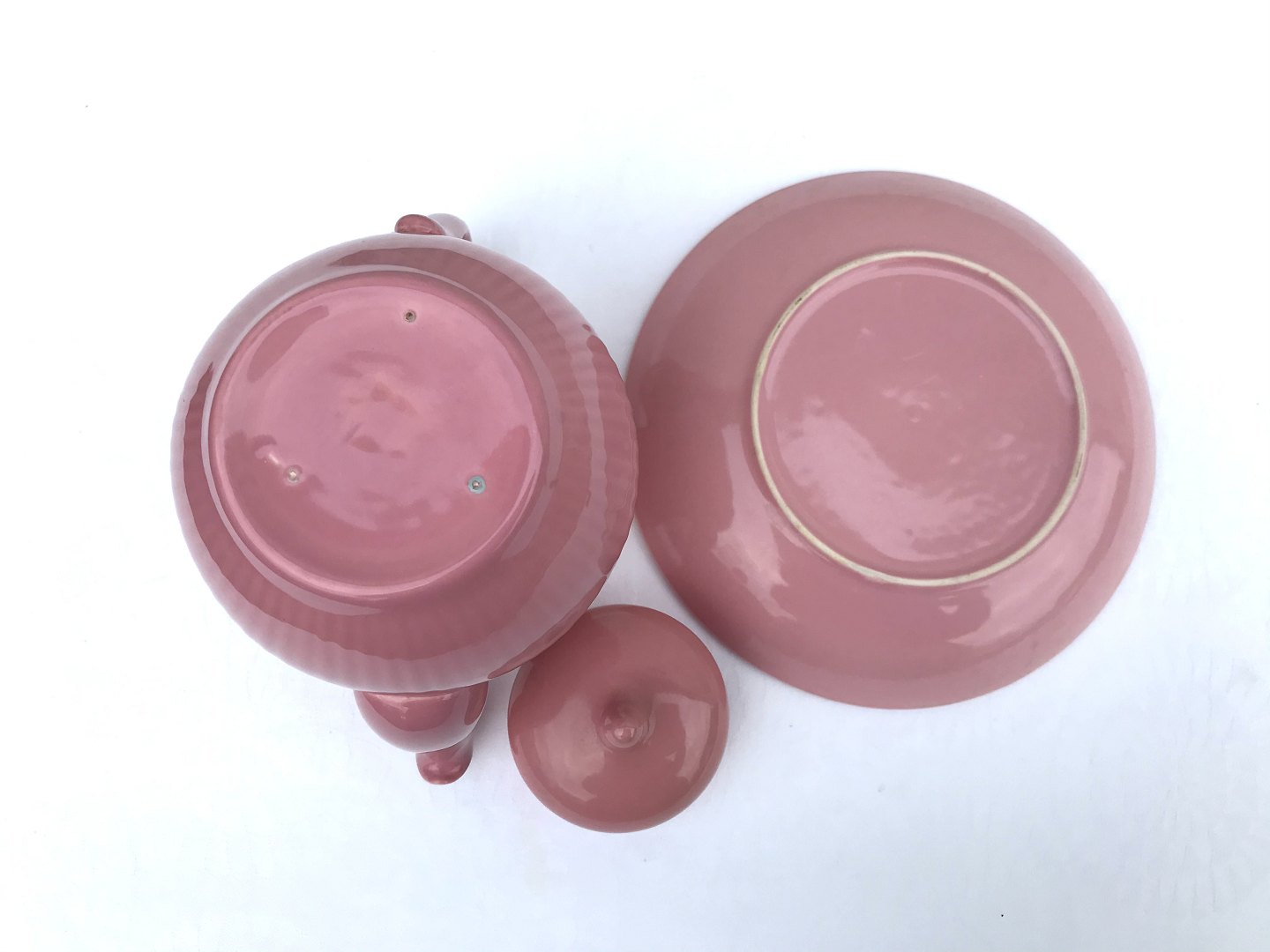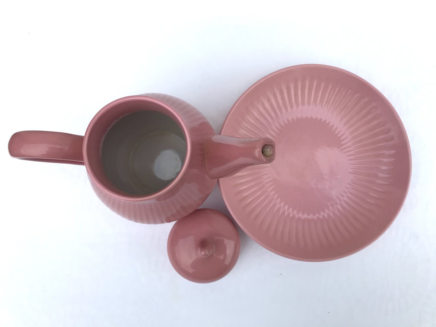 | Bornholmsk keramik, Søholm, Kaffekande og tallerken, Rosa uden stempel, Kande 18cm høj, 17cm bred, Tallerken 18,5cm i diameter, 2.sortering *Pæn stand*