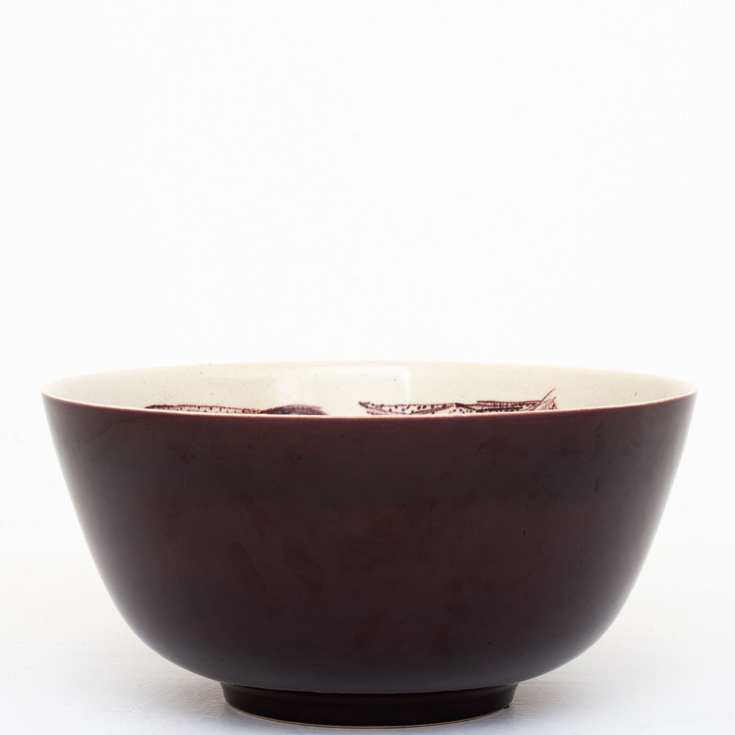 Large bowl in faience decorated with Sang de boeuf glaze / Oxblood glaze. Signed. 1960.