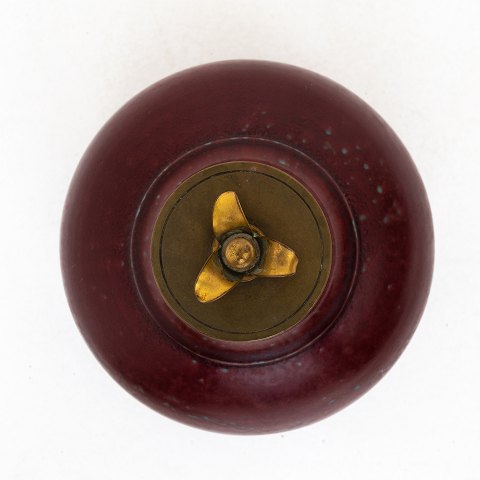 Sjælden lågkrukke i stentøj med okseblodsglasur, base og låg i delvist forgyldt bronze. Låg lavet af Knud Andersen. Signeret.