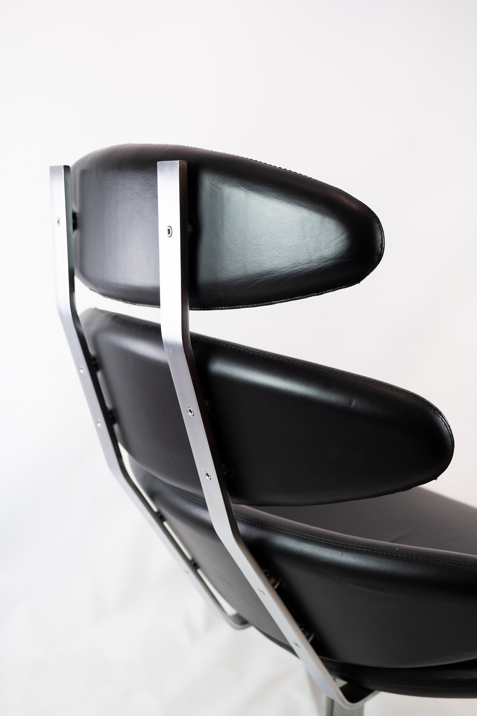 Corona hvilestolen, model EJ 5, designet af den talentfulde Poul M. Volther i 1964 og fremstillet hos Erik Jørgensen. Denne stol er polstret i sort Cava læder og repræsenterer en perfekt balance mellem komfort og æstetik.