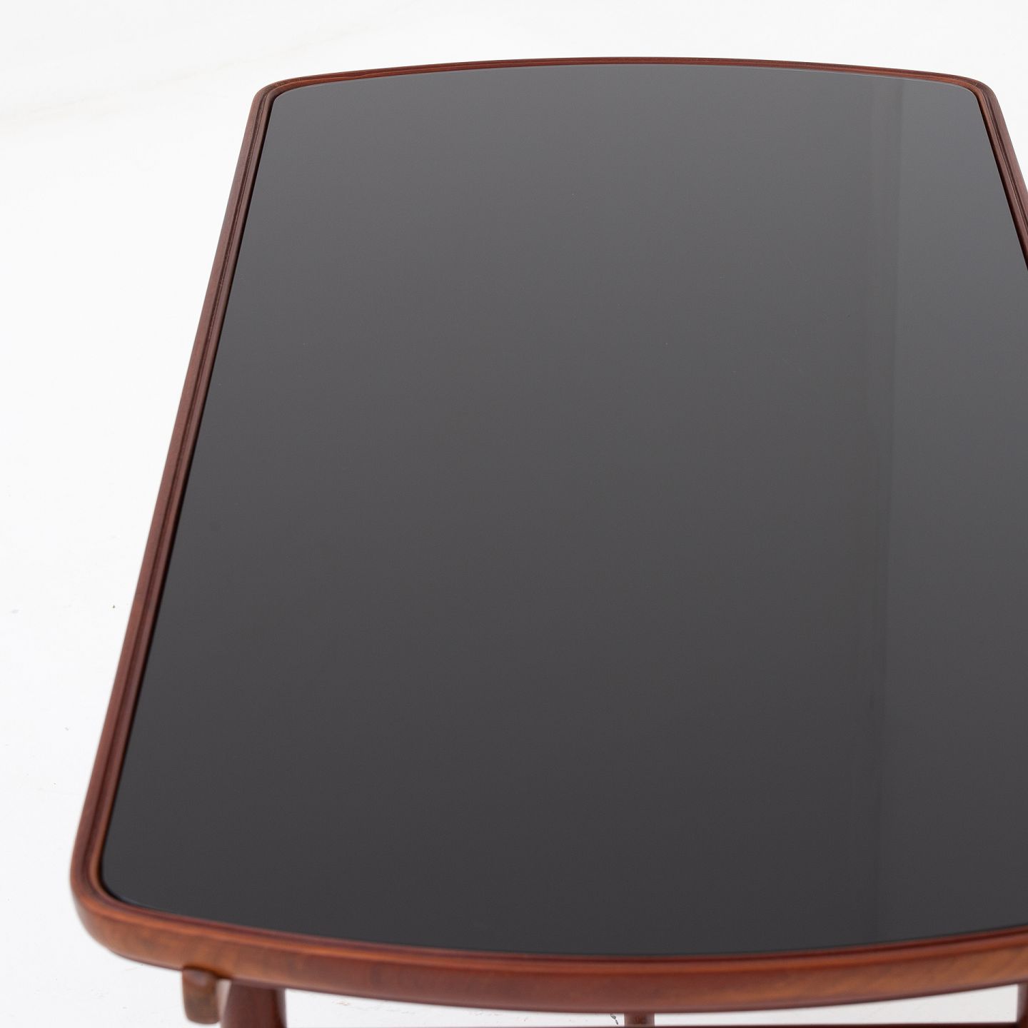 Coffee table in solid Cuban mahogany and shoes in brass with top in black glass.