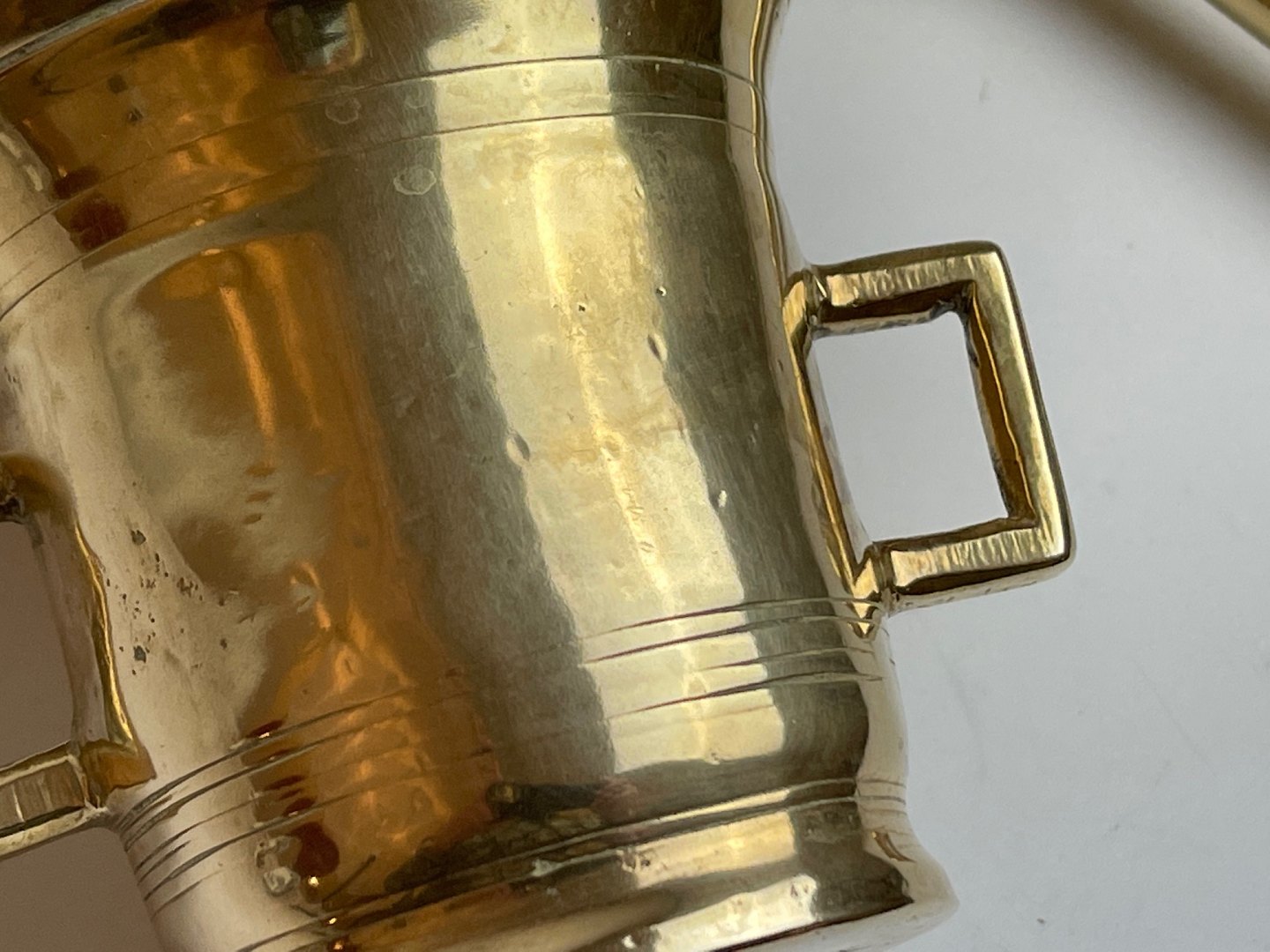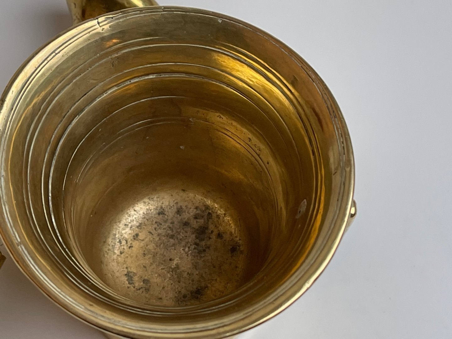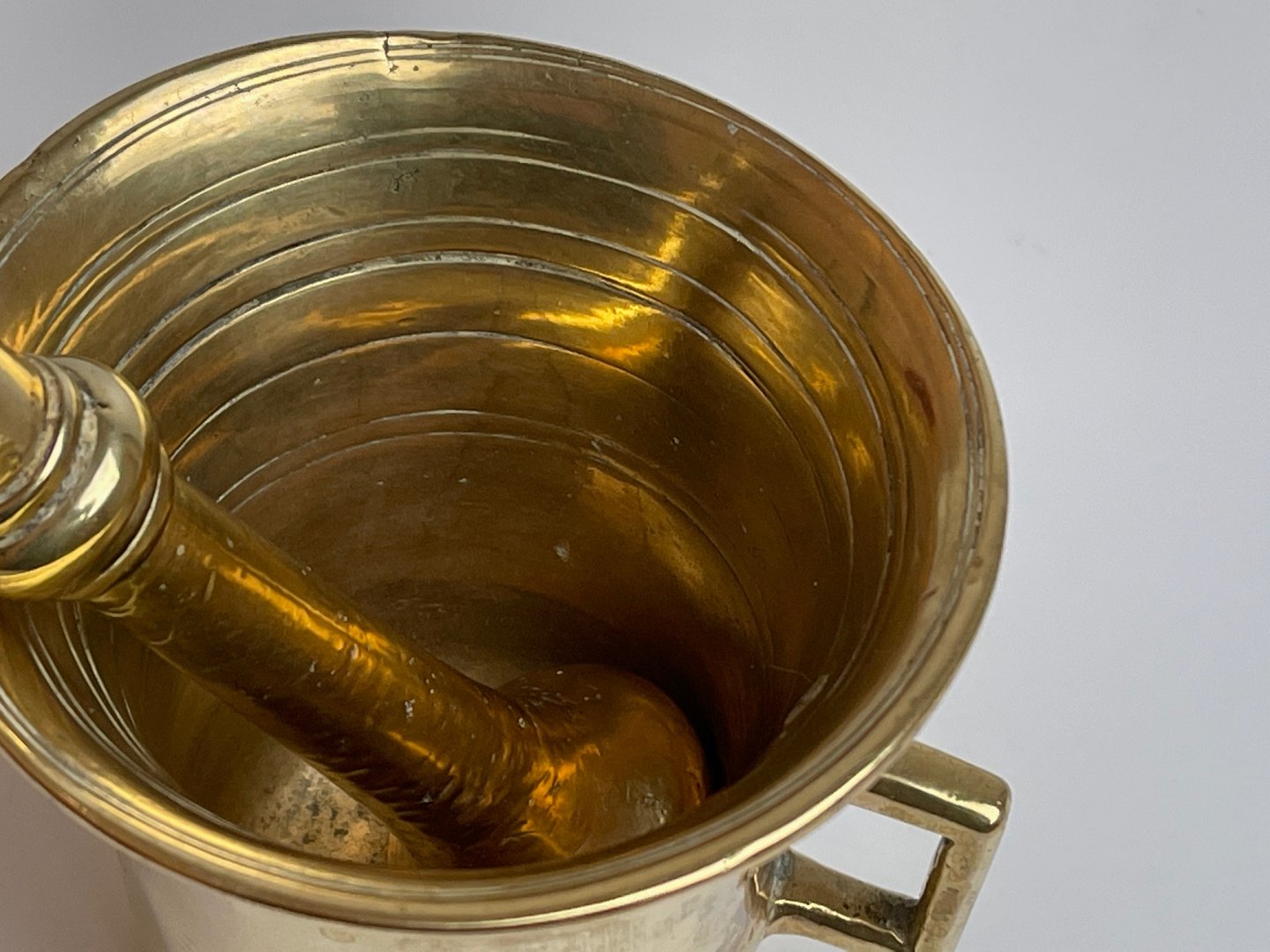 Fine, antique brass mortar with pistil. Both the mortar and the pistil are marked alike so that you can see they belong together.