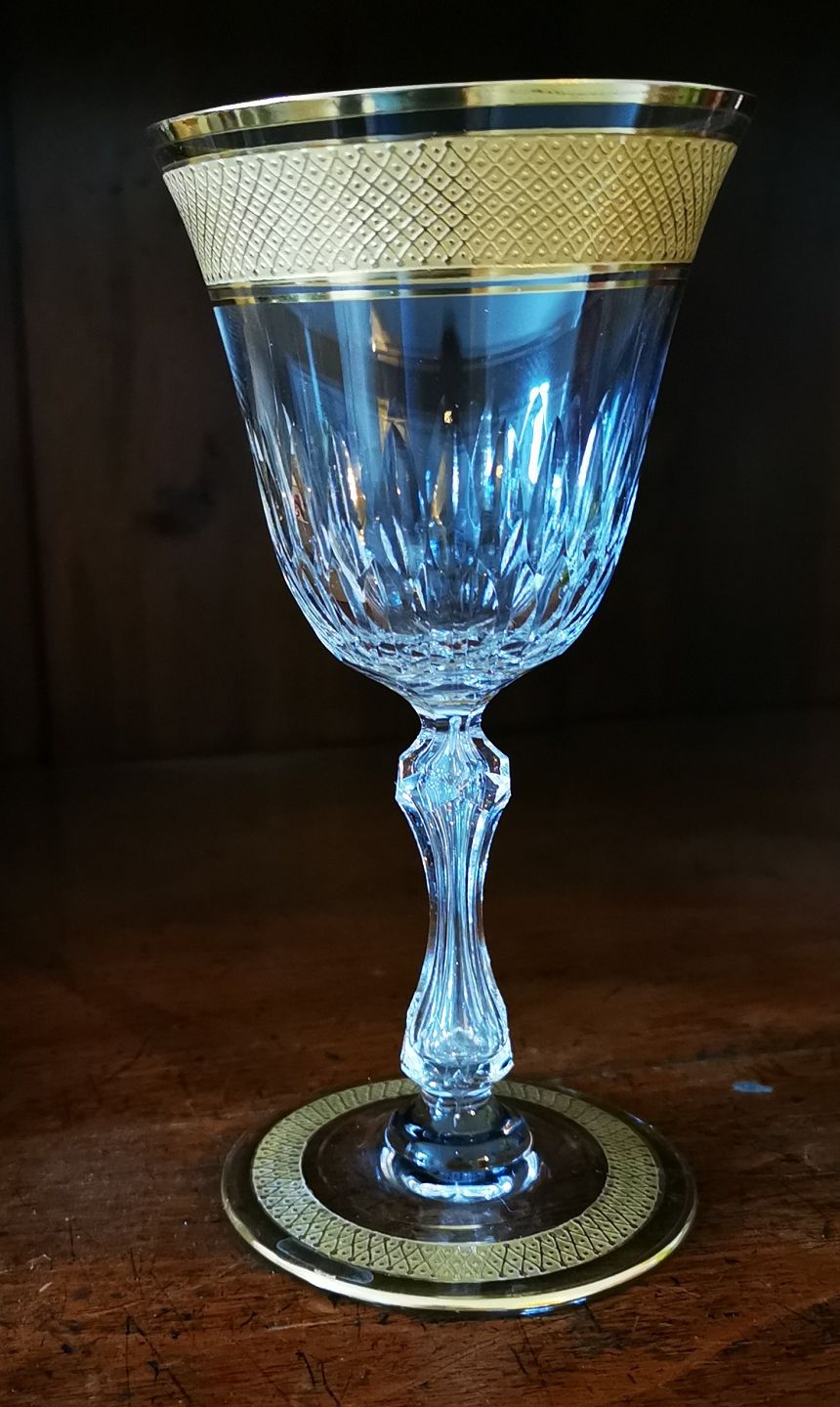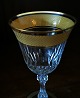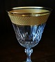 Crystal wine glass STL75 by St. Louis with wide belt gold-decorated belt on both the glass foam and the base. Deep cuts on the basin and faceted hollow stem. Three PCS. haves. All in mint condition. The price is per. PCS. H. 17 cm