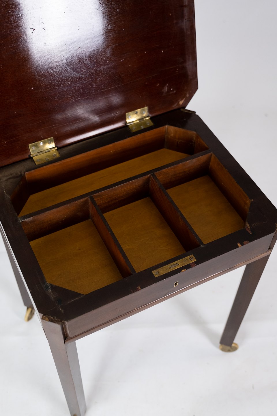 Side table of mahogany with inlaid wood and on wheels from the 1890s.