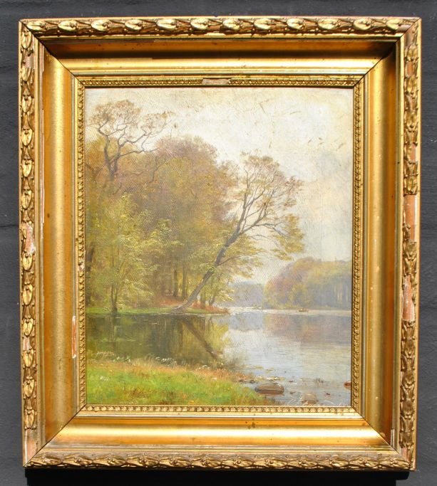 Aagaard, Carl Frederik (1833 - 1895) Denmark .: A boat on a lake - spring. Signed 1893. Oil on canvas. 28 x 23.5 cm. Framed. 38 x 34 cm.