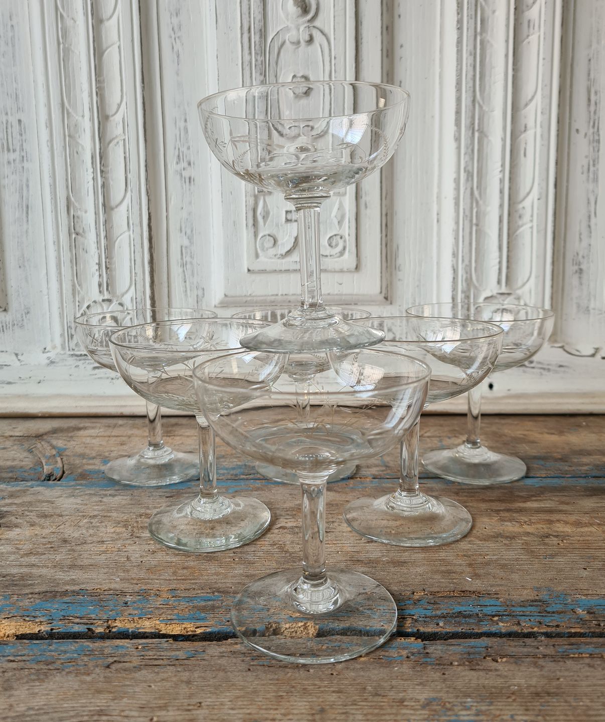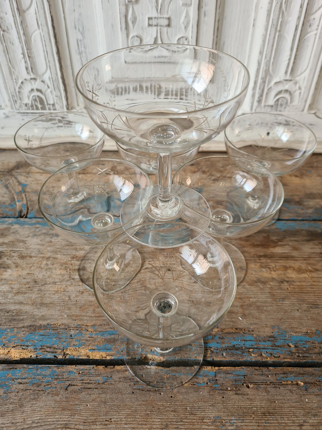 Set of 7 French champagne glass decorated with fine sandings from the 1940s.