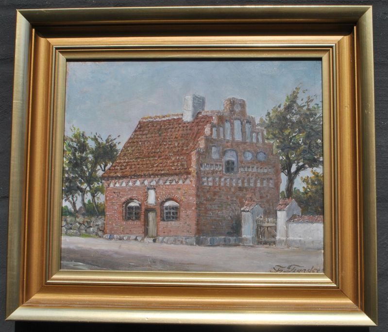 Frandsen, Frands (1885 - 1979) Denmark: The old Latin school in Skælskør. Oil on masonite. Signed. 21 x 26 cm.