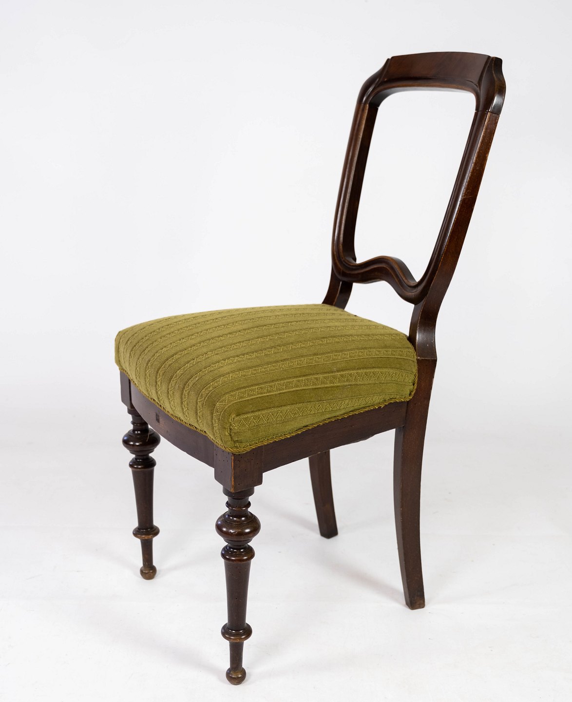 Set of four dining room chairs of mahogany and upholstered with green fabric from the 1890s. The chairs are in great vintage condition.