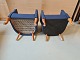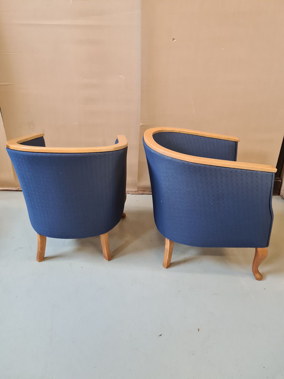 1 Lænestol med kant af egetræ og blåt betræk , fra 1980erne.