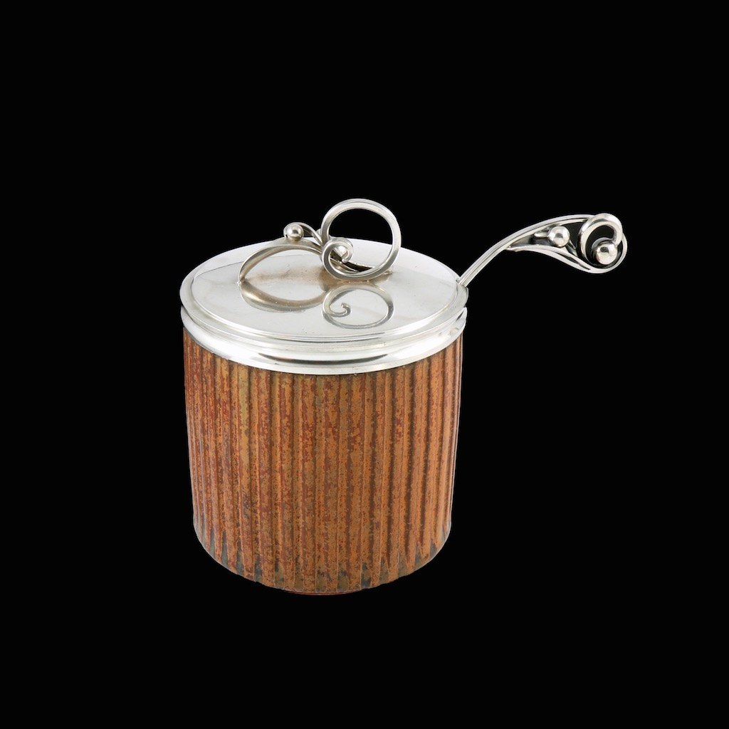 Arne Bang (1901 - 1983). Stoneware Jar with Silver Lid and Spoon.