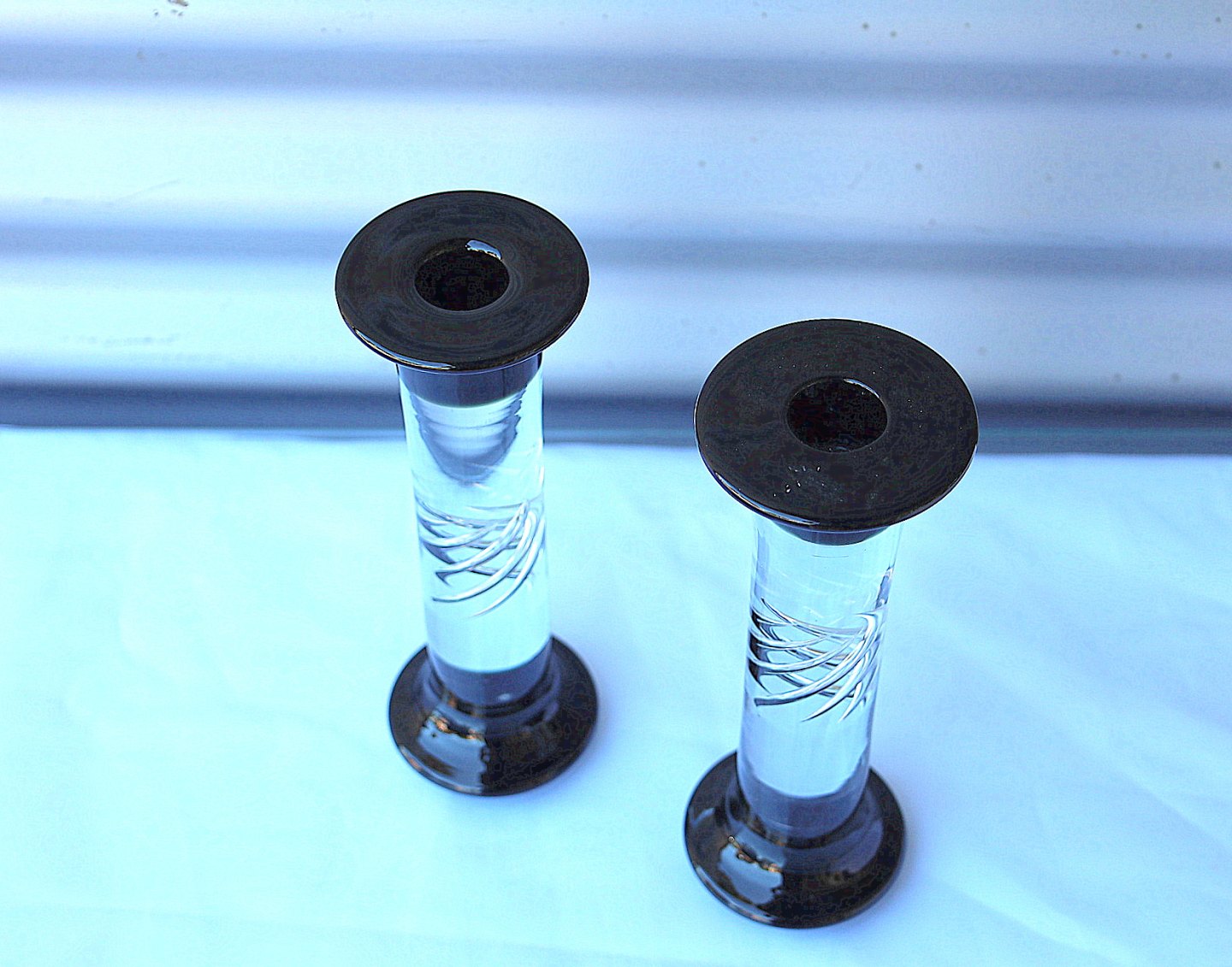 Text available in Danish: Holmegaard Glasværk. Lysestager, High Life. Lysestagerne er klare med bund og top af sort opalglas, på stagerne er der, midt på, indvendige snoninger.