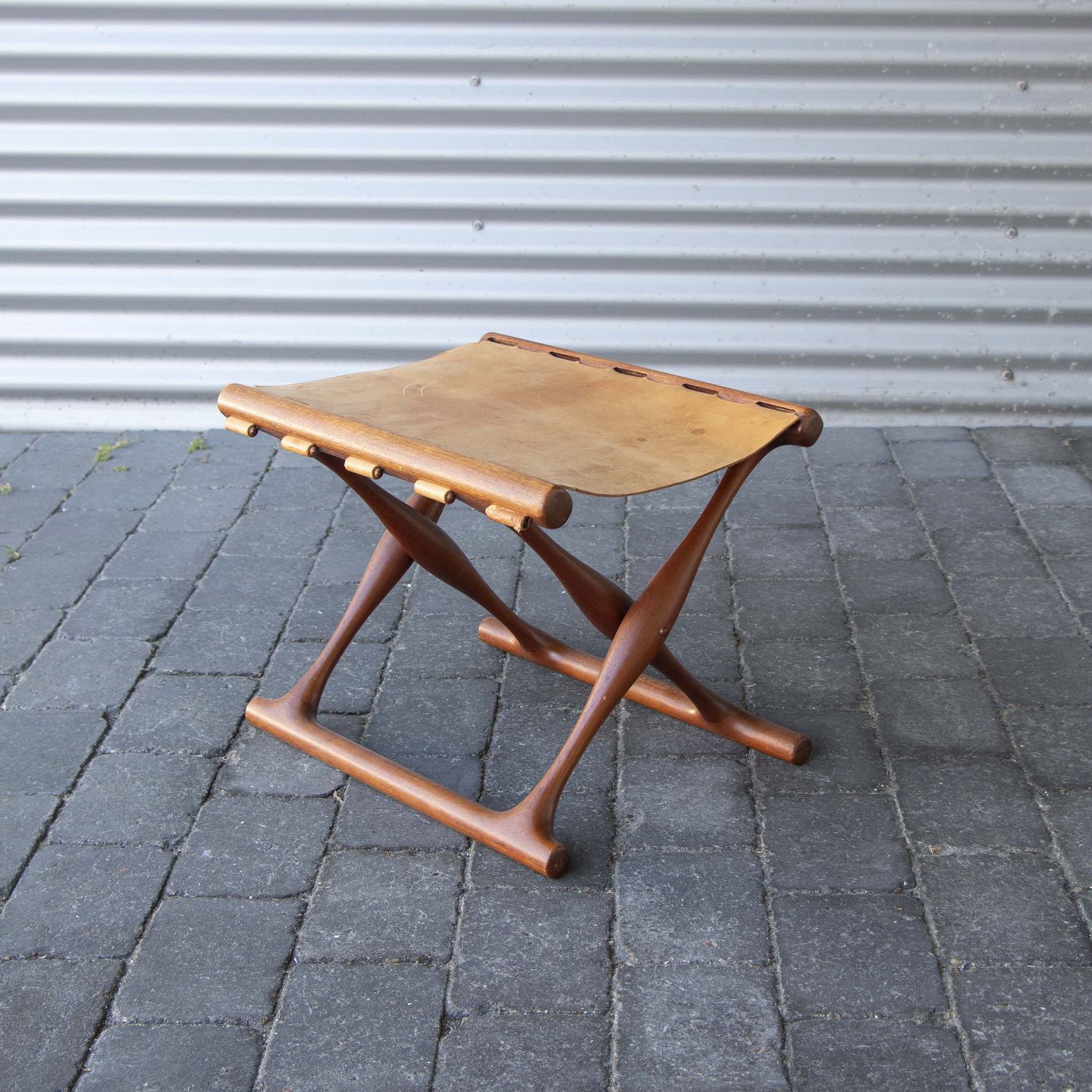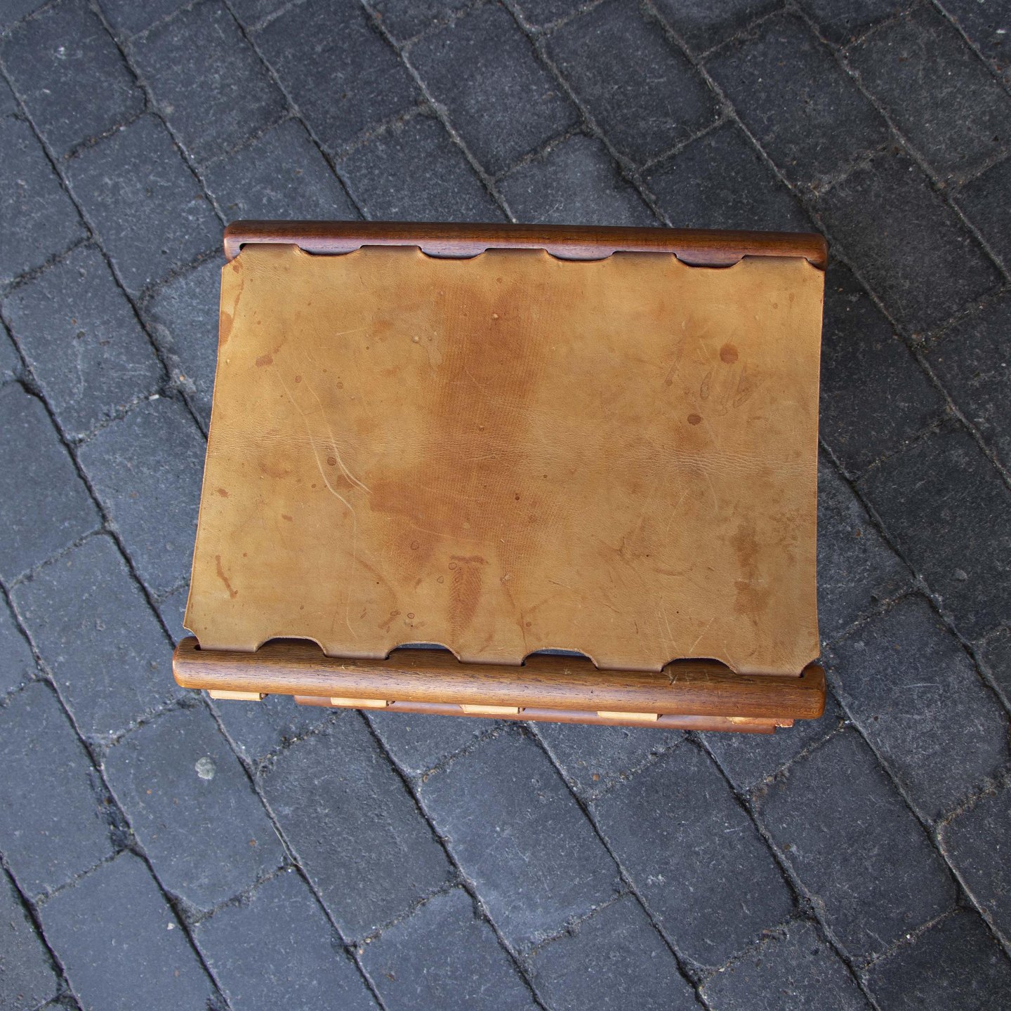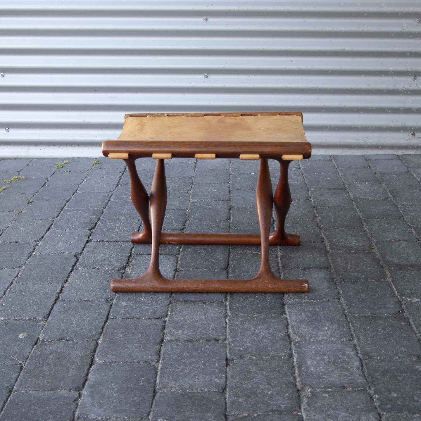 Skammel i teaktræ med sæde i cognacfarvet kernelæder