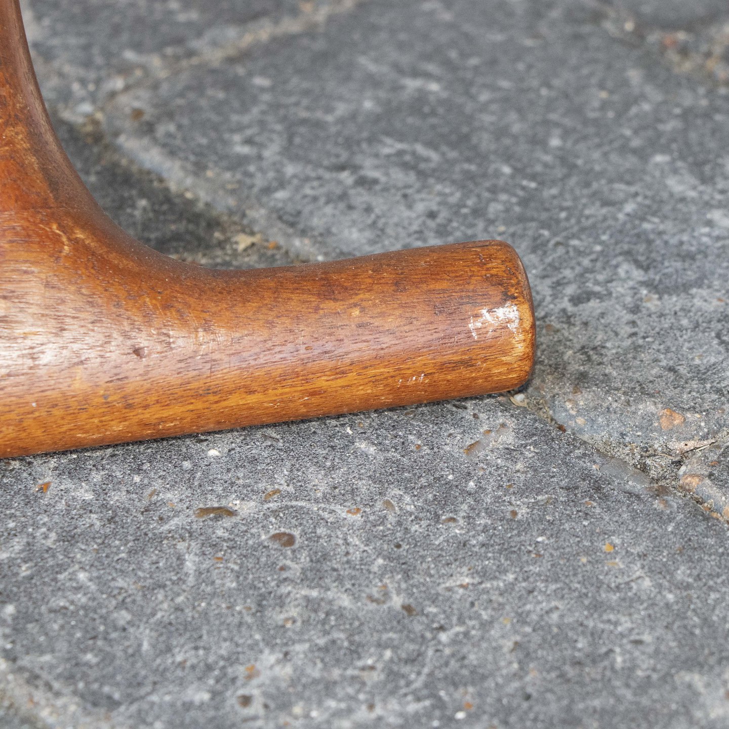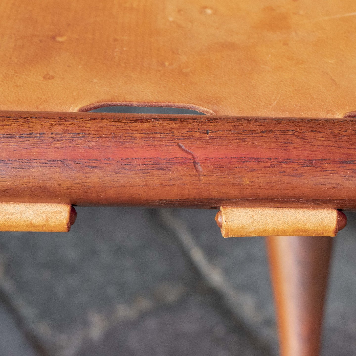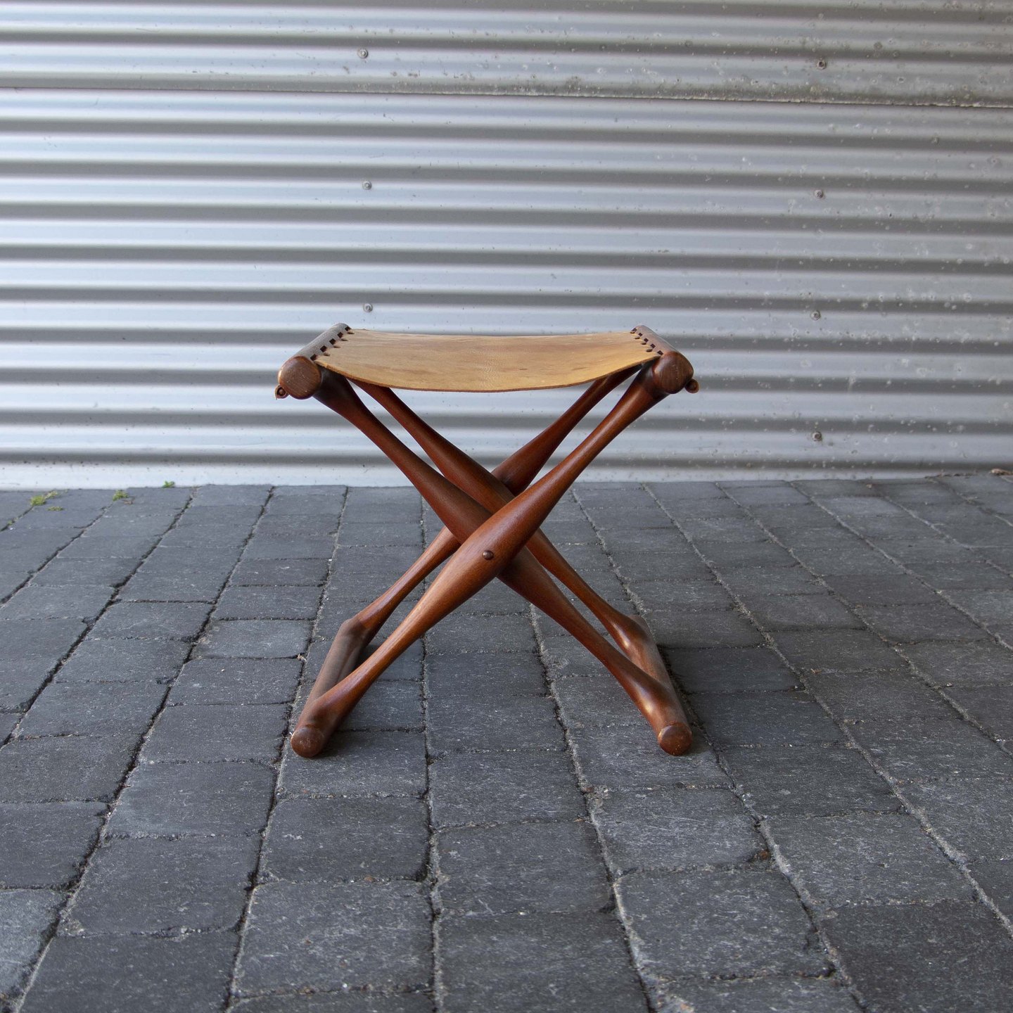 Skammel i teaktræ med sæde i cognacfarvet kernelæder