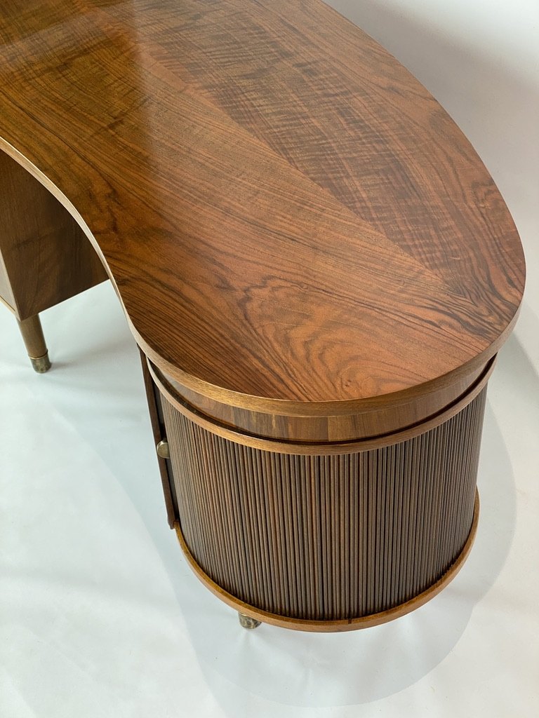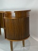 Kai Kristiansen var kendt for sit talent for at kombinere æstetik med funktionalitet, og dette skrivebord er et glimrende eksempel på dette. Det indbyggede barskab og jalousilåger tilføjer ekstra opbevaringsplads og skaber samtidig et rent og strømlinet udseende.