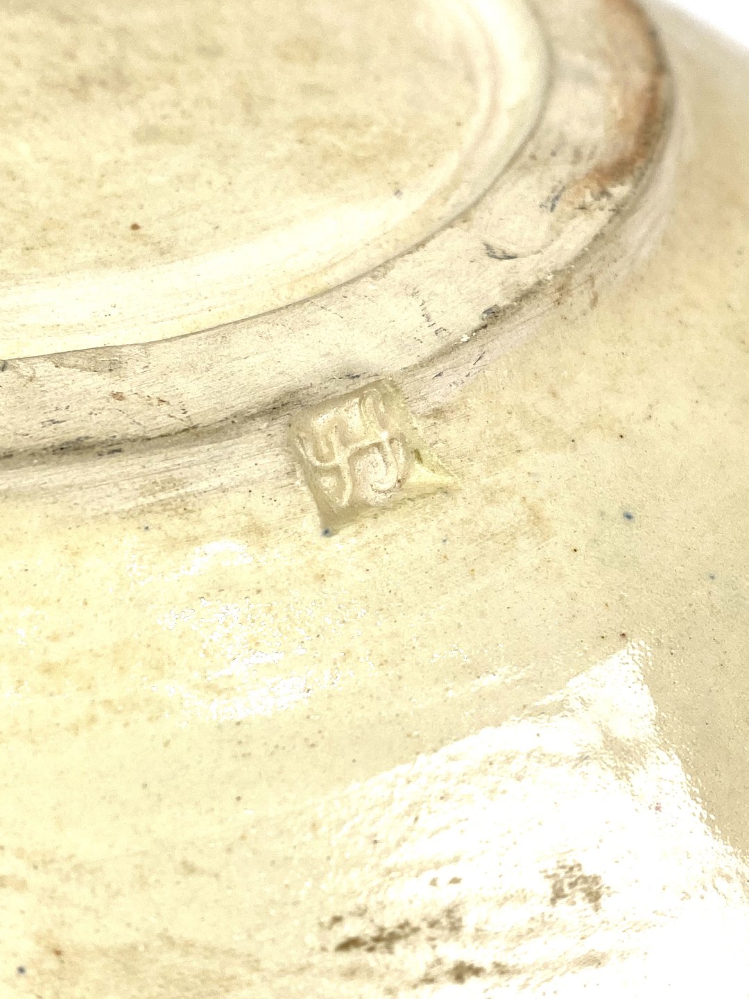 Fad eller øreskål af ler med lys glasur dekoreret med mønster fra 1910erne.