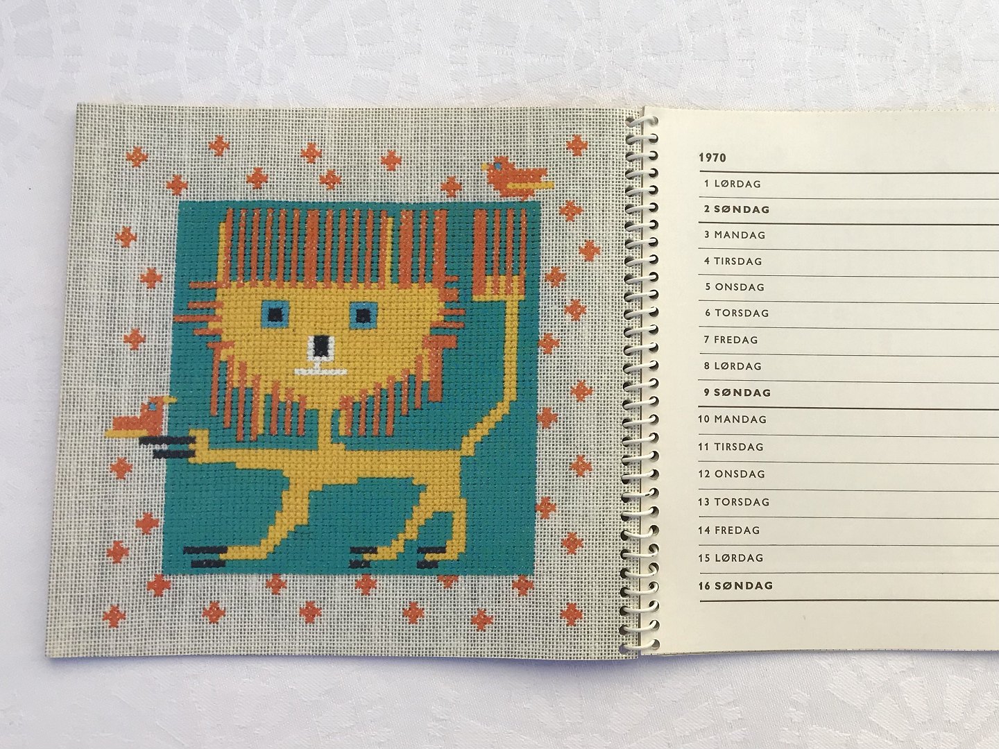 The promotion of needlework, Cross Stitch Calendar of the Year 1970, Walk of the Year at the zoo, Design Ruth Kristensen * Nice condition but with a few notes on the calendar pages *