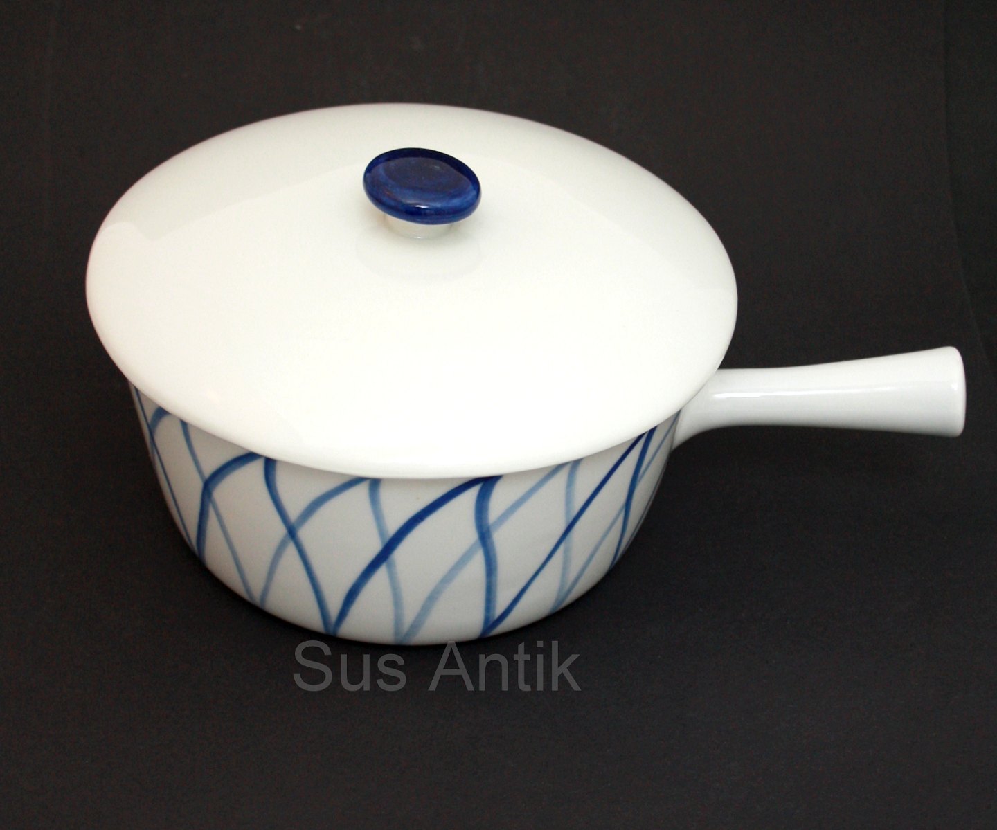 Text available in Danish: Lyngby, Dan-Ild, Harlekin/Blå flamme, Design Axel Brüel i 1958. Ildfast porcelæn blev solgt under sloganet fra ild til bord. Stor kasserolle med låg. Højde 12 cm. Diameter 18,5 cm. Pris: 300 kr. stk. Lager: 1