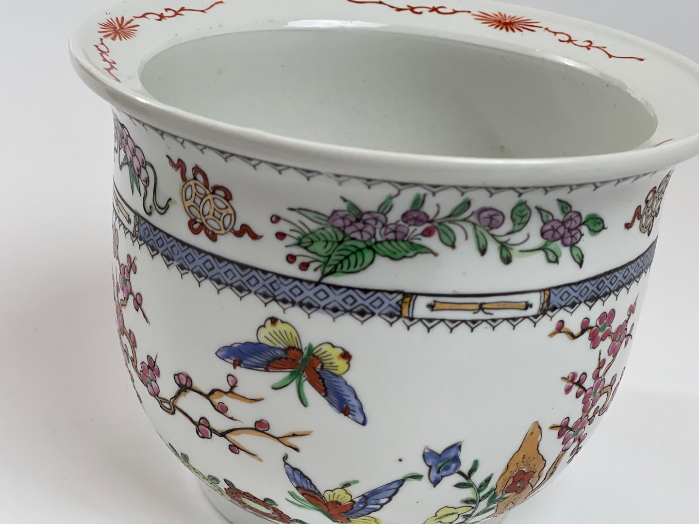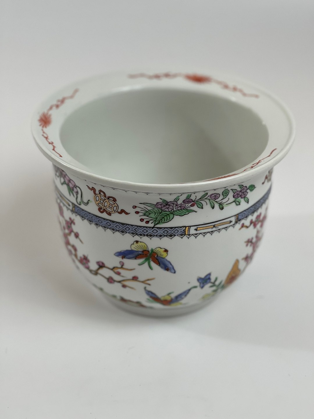 Chinese flowerpot / cache pot with motifs of butterflies and cherries. 20th Century.