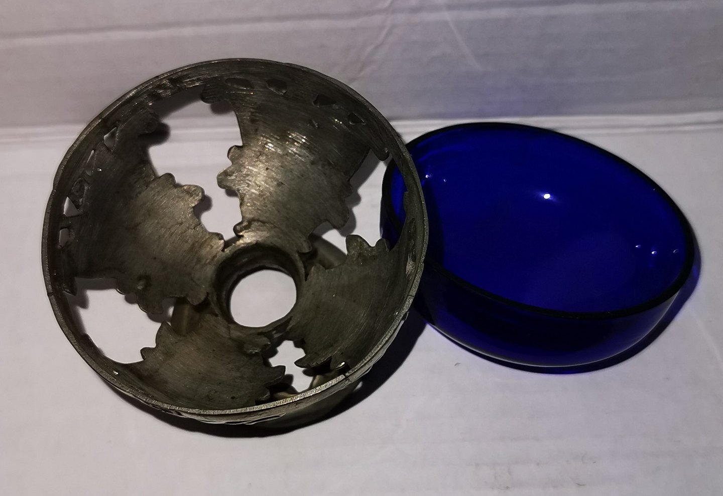 Mogens Ballin´s successor: Openwork tin bowl with art nouveau work decorations. In it blue glass inner bowl. Produced at Mogens Ballin´s Eftf.'s workshop Hans Peter Hertz, who also worked with silver during the same period. Manufactured around 1920. Stamped HPH (Hans Peter Hertz) and model number T 227. Appears in good condition without damage or repairs. H. 7½ cm.